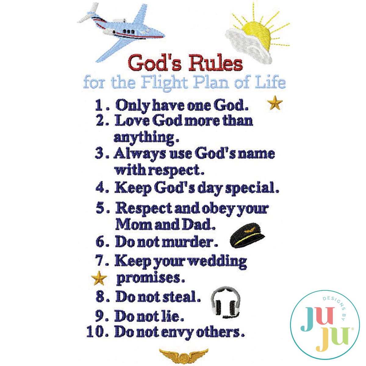 The design is available in a large format for very large hoops (such as for the PR620, Brother Innovis D, etc. as well as in a 3 part version for the 5x7 hoops. Also included as separate single designs are the pilot hat, pilot wings, pilot head set, and small airplane for use in coordinating projects. You are receiving a total of 9 stitch files.