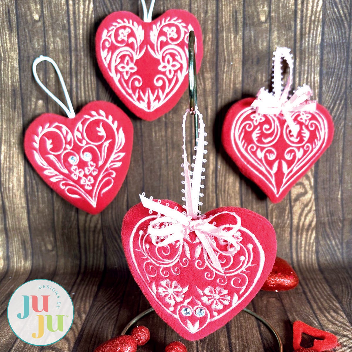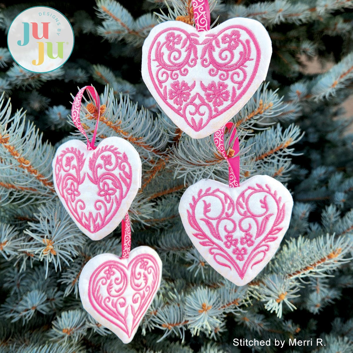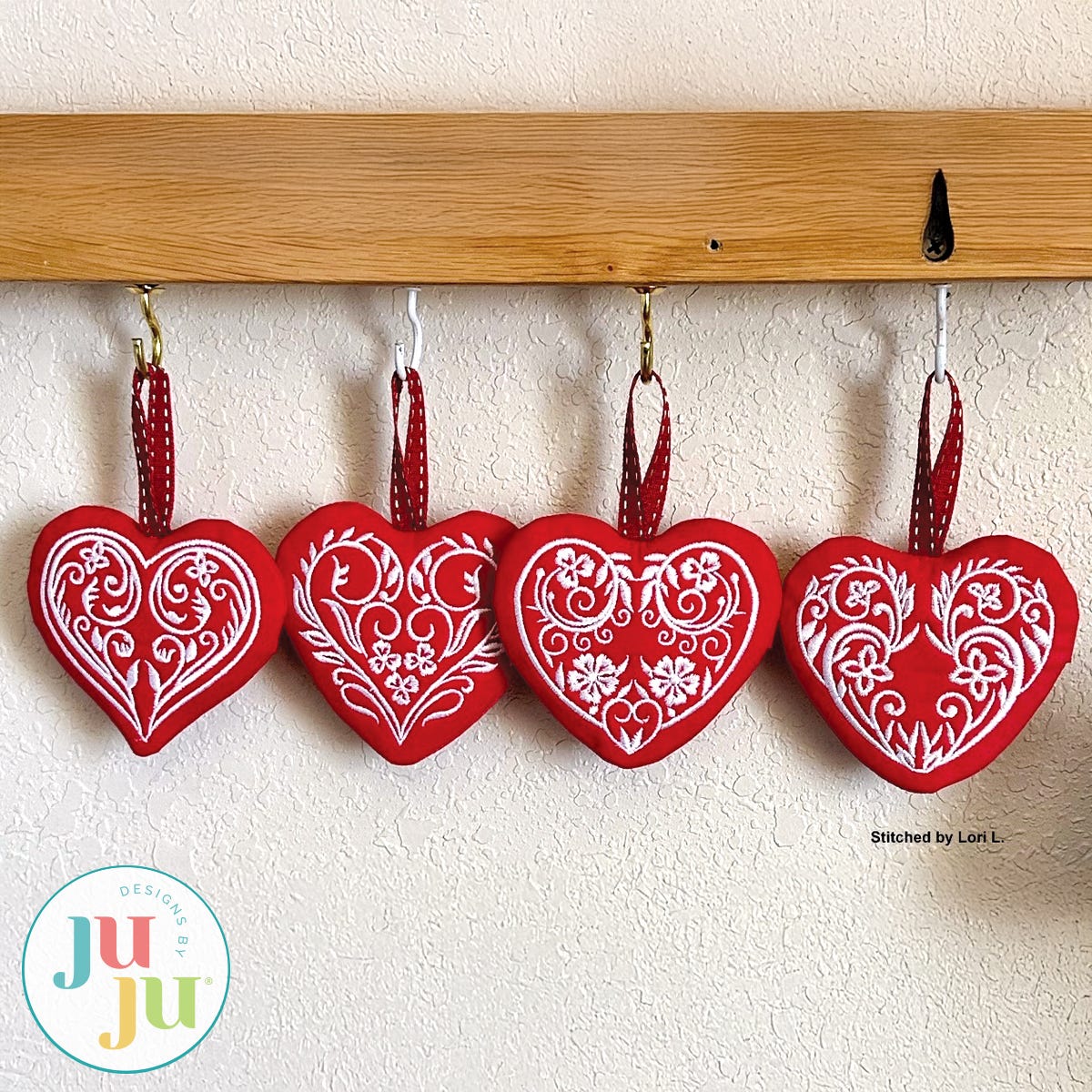 These 3D hearts are fast to stitch and make an attractive home decoration. They look great added to your gift packages as well. The ornaments are completely stitched in the hoop. There is no sewing machine or hand stitching required. Embellish them with crystals if you wish. Each heart is lightly stuffed with polyester stuffing and then fused shut in the back. The ribbon at the top is optional.