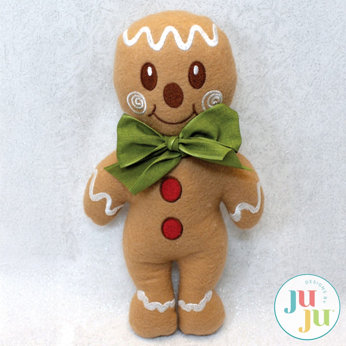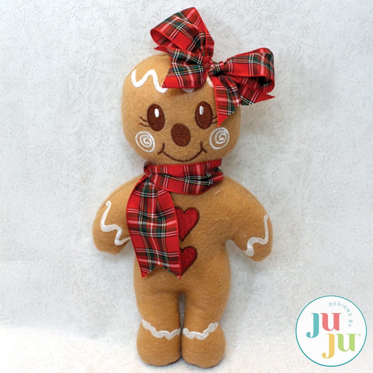 You have loved our little gingerbreads; we thought you might enjoy this bigger version. These are great for placing on a shelf or on a fireplace mantel piece or have them peeking out from a Christmas stocking. Grandkids love them!! Stitched from felt, they stitch up quickly and easily. Just a small seam needs to be stitched closed in the back; the rest is all done in the hoop.