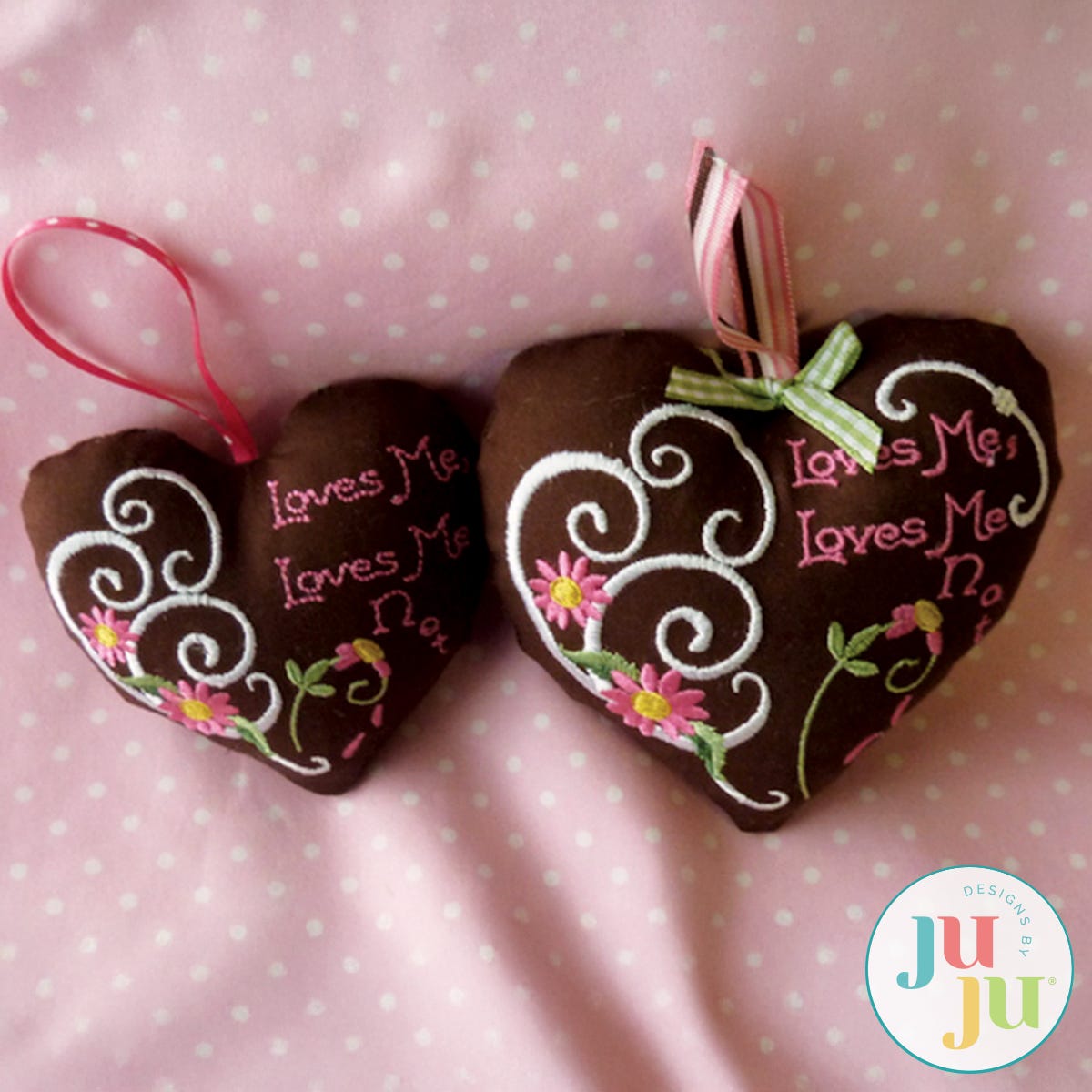 The heart comes in two sizes — one fits in standard 4x4 hoops; the other one measures 5x7. Also included are two plain versions, without the scrolls and daisy embroidery so you can fussy cut and showcase fun fabrics of your own choosing. In all, you are getting 4 stitch files with your download.
