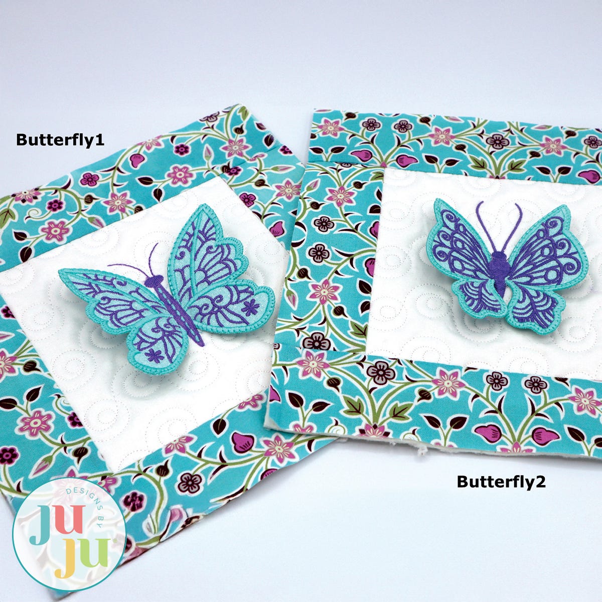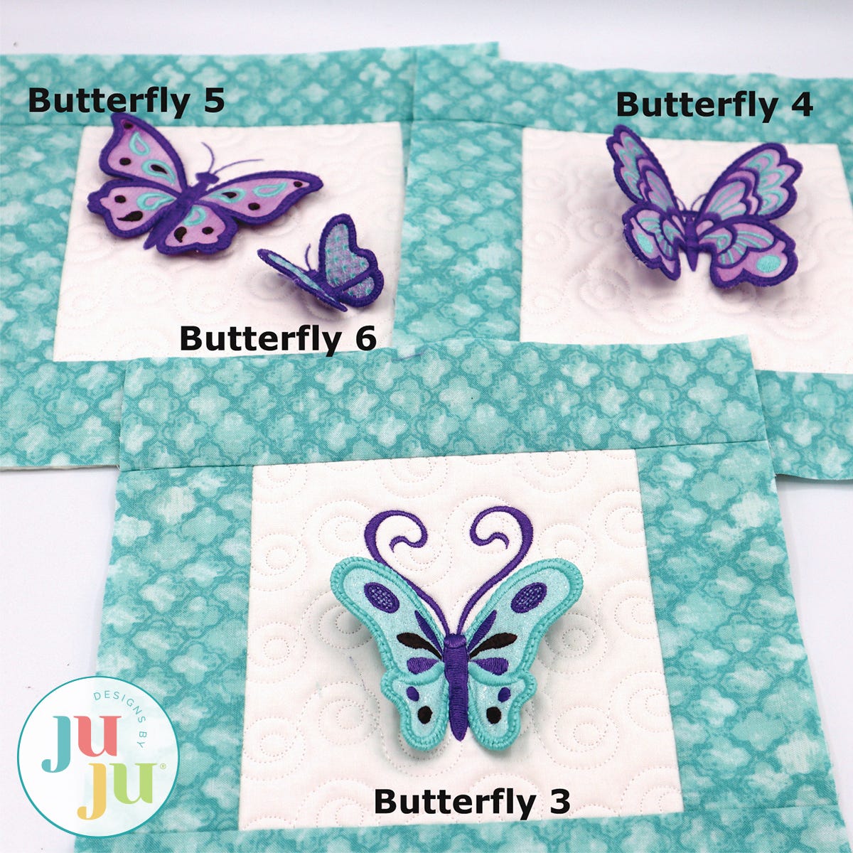 What a fun and versatile set of designs! The wings of the butterflies are freestanding. That makes these butterflies different from your usual applique designs. Perfect for a little girl’s quilt, for placing on pillows, dresses, jackets, totes etc. Vary the fabrics and threads and you will be surprised just how many different looks and styles are possible. There are a total of 6 butterflies.
