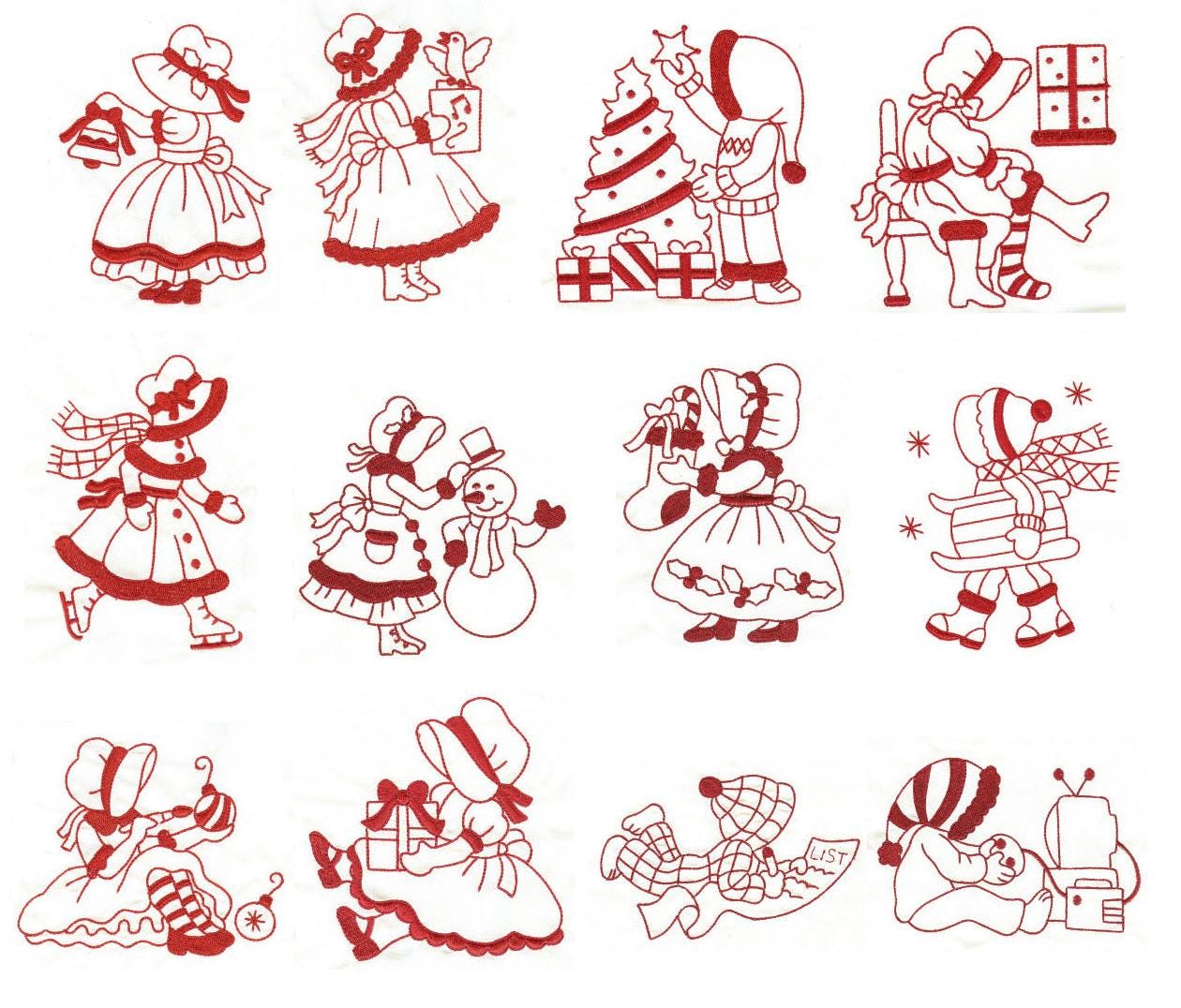 Just in time for some last minute Christmas projects, this unique Sunbonnets redwork set is just darling. Super quick to stitch and very effective for a cute, whimsical and elegant look to your projects.
