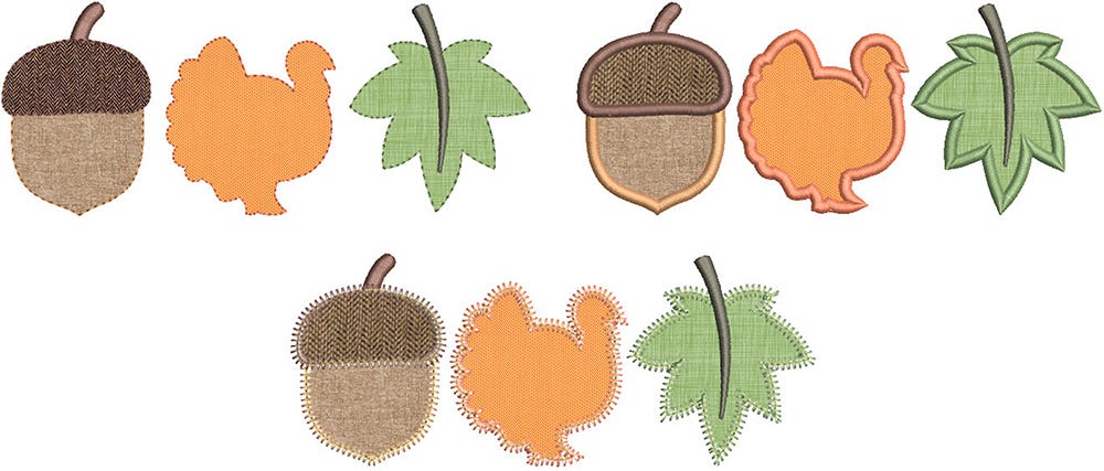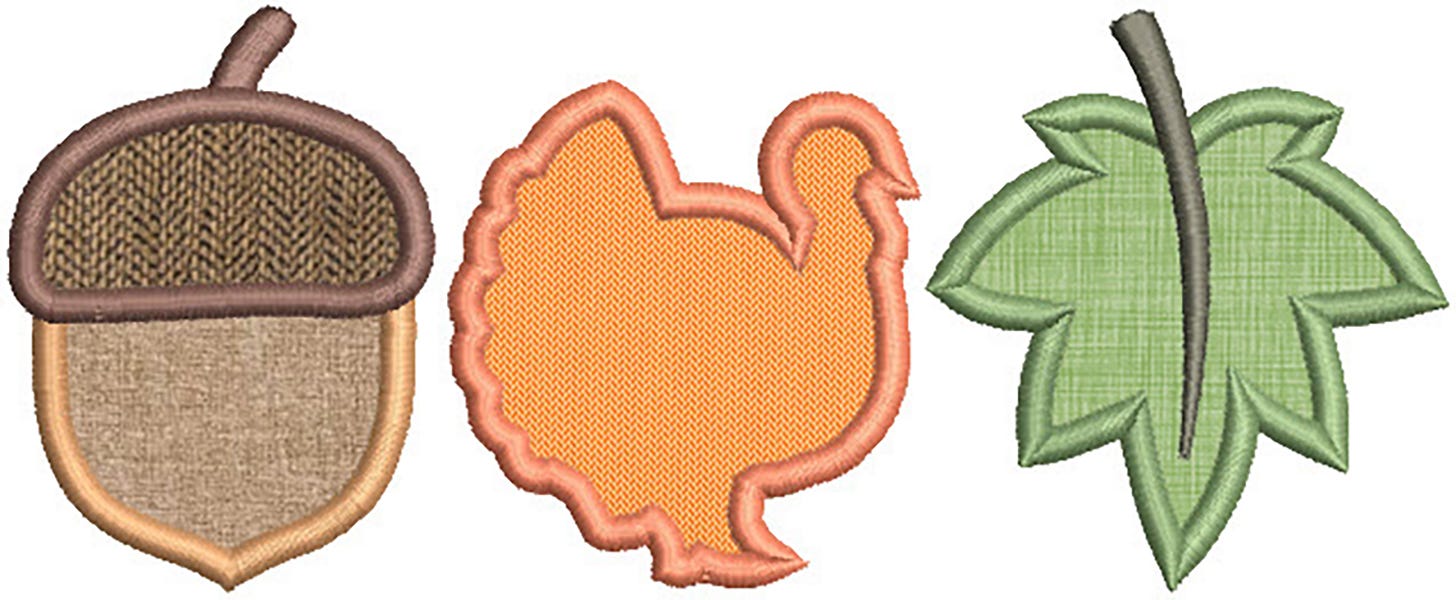 This fall trio of an acorn, turkey and leaf comes in three applique styles: traditional satin stitch, zig zag stitch, AND bean stitch!