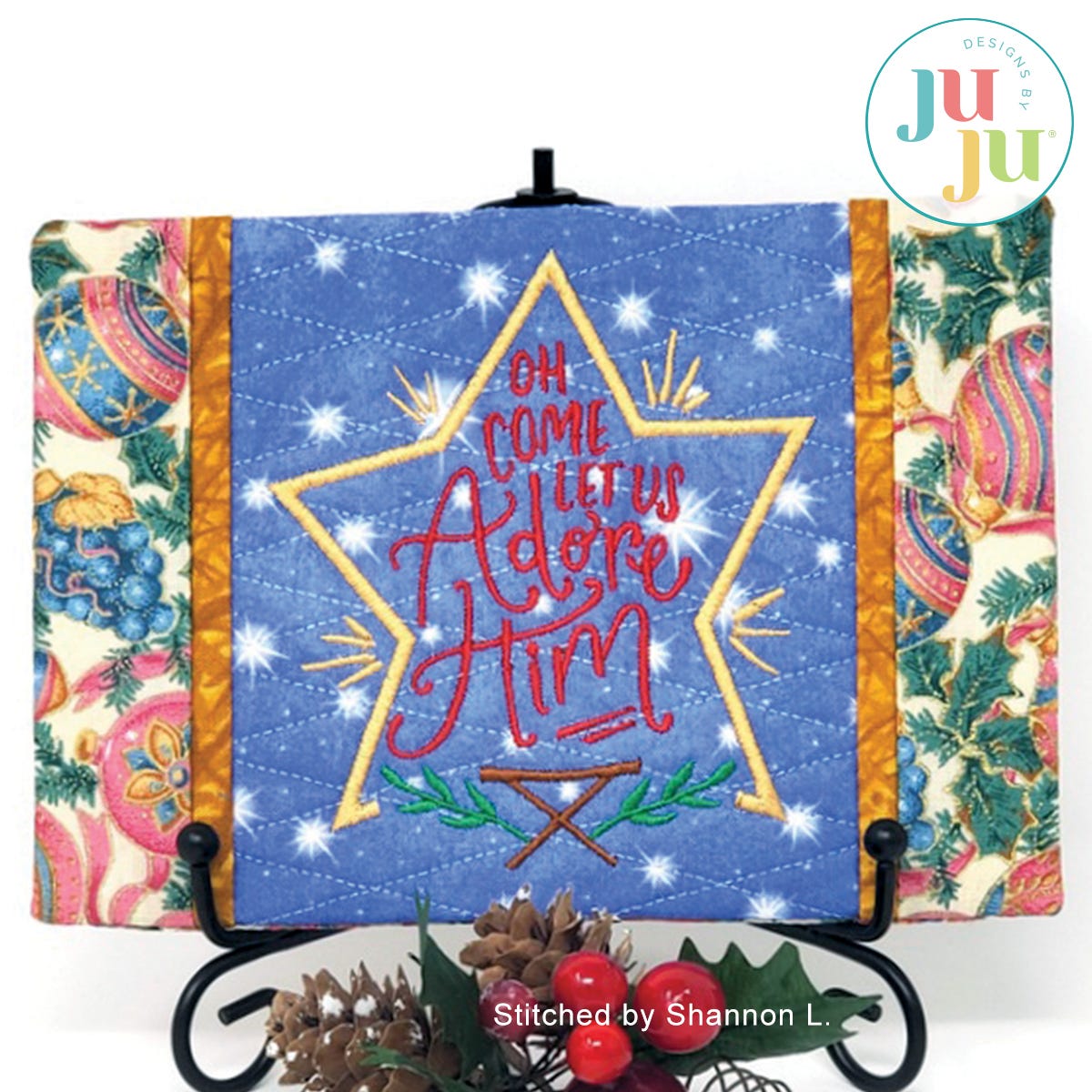 This simple yet beautiful design is a reminder of the true meaning of Christmas. The center is lightly quilted and the contrast strips and outer borders are attached while in the hoop.