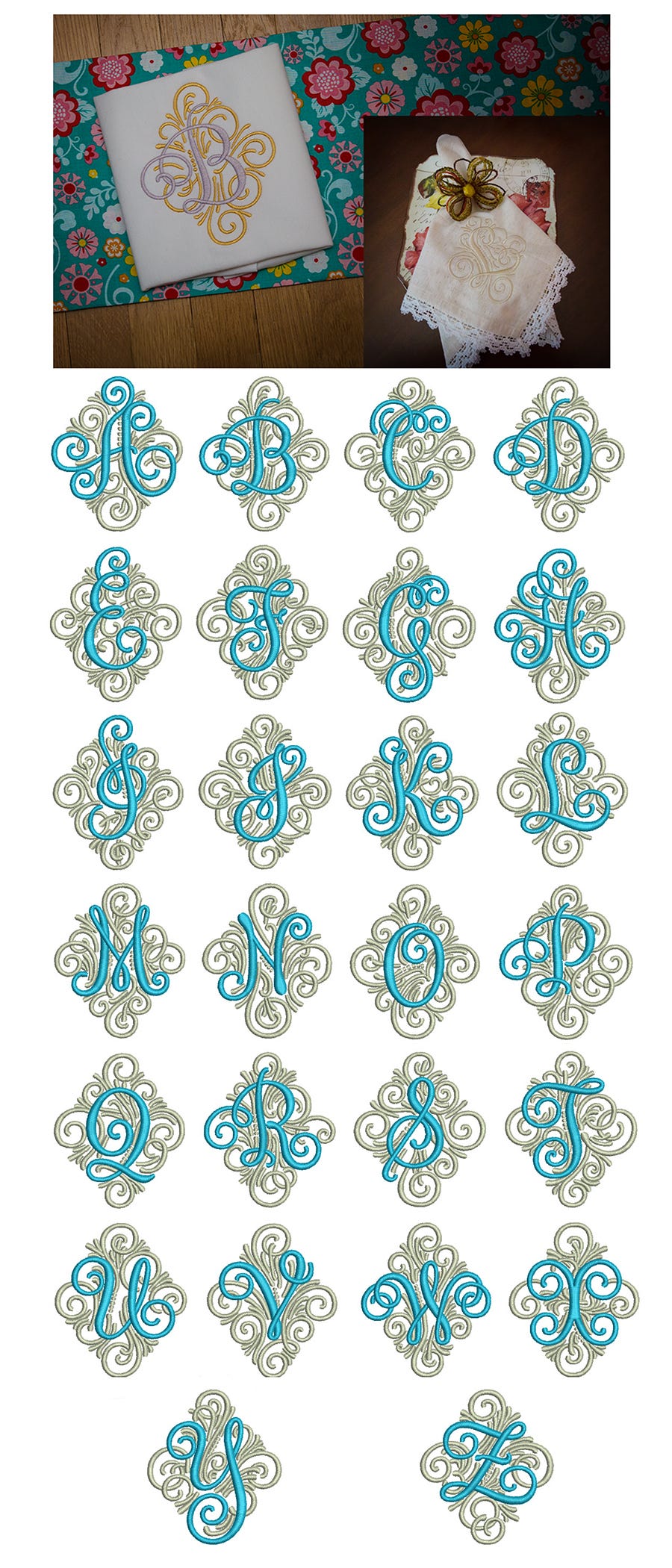 Absolutely stunning monogram comprised of swirls, swashes and dots. This very ornate monogram is wonderful as a one or two color monogram. The initials themselves are a separate color stop, or you can stitch it all as one color. These look equisite on linens, lightweight fleece, towels and more! All of our fonts are 100% manually digitized to ensure the highest quality.
