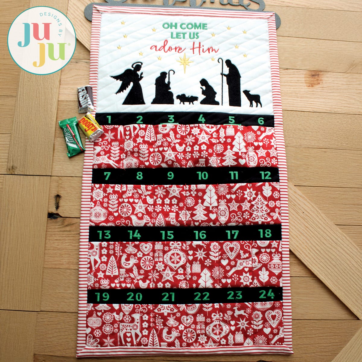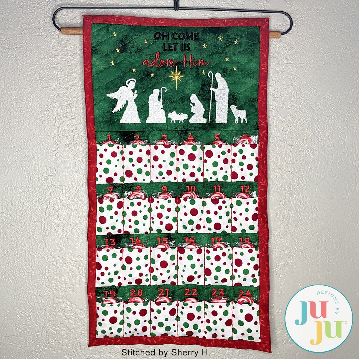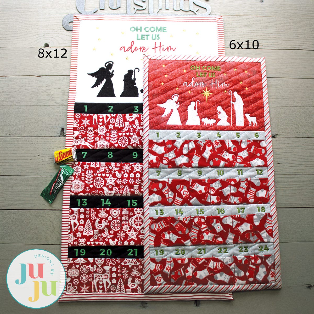 What a fun project for the Christmas Season. Children of all ages will enjoy this calendar. It comes with small pockets for the 24 days before Christmas. The pockets are just big enough to hold a wrapped chocolate piece or other candy. The pockets are small (1.50" w x 2.00" h ) for 6x10 hoop and (1.80" w x 2.60" h) for 8x12 hoop so flatter candy works best. Of course, a surprise dollar in the pocket would also be welcomed, I am sure. Or how about tucking in a note of inspiration or encouragement for each day?