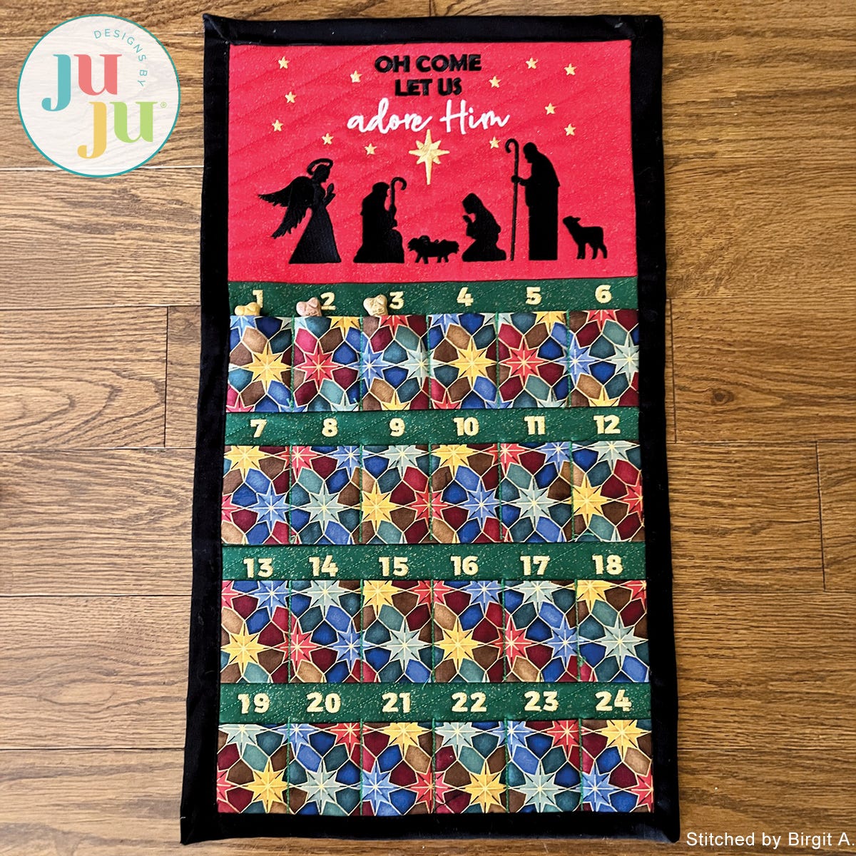 There are 3 panels that are separately constructed in a 6x10" hoop and 8x12" hoop then stitched together on the sewing machine. The background of the calendar is lightly quilted. The faux binding also gets attached on the sewing machine. It is easy to do; we show you how.