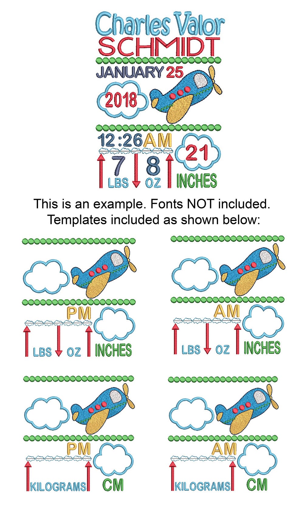You will receive the embroidery templates shown. Customize with your own names, date, weight and length with fonts from your purchased collection or those that are built in to your embroidery software.Ā I have included a "basting" stitch as the first step so that while you are customizing in your software, you can ensure to stay with the parameters of your hoop. Skip the first step upon stitching.