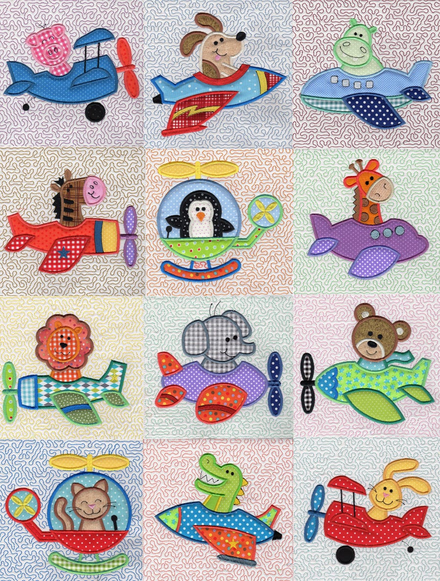 Here is a seriously adorable set perfect for the little ones in your life! Our artist,Chris Brown, has come up with 12 darling animals in planes and helicopters. Alone, they are positively precious as applique. But we took it a step further. Our tester, Margie, has been after me for months since our other popular applique sets with stipple backgrounds, to do another.