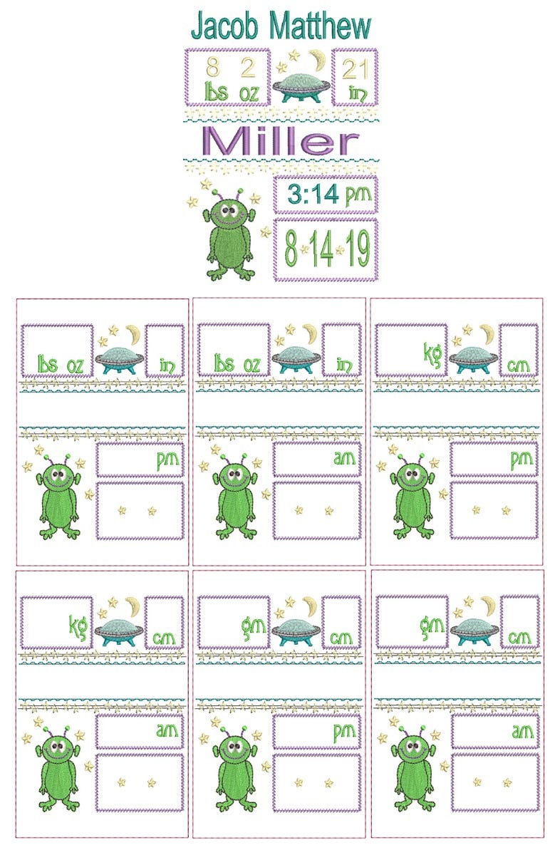 You will receive the embroidery templates shown. Customize with your own names, date, weight and length with fonts from your purchased collection or those that are built in to your embroidery software. Fonts are NOT included with these templates. I have included a "basting" stitch as the first step so that while you are customizing in your software, you can ensure to stay with the parameters of your hoop. Skip the first step upon stitching.