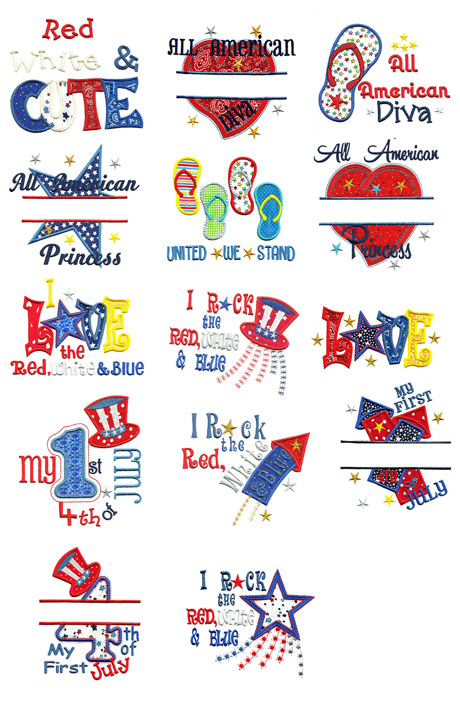 Here is a large set of 14 All American Applique designs...some full applique, others are split to customize with names or words using your purchased fonts and customizing software. All designs come in 4 sizes: Ā 4x4 hoop, 5x7 hoop, 6x10 hoop and 8x8 hoop. Ā Happy Fourth of July!