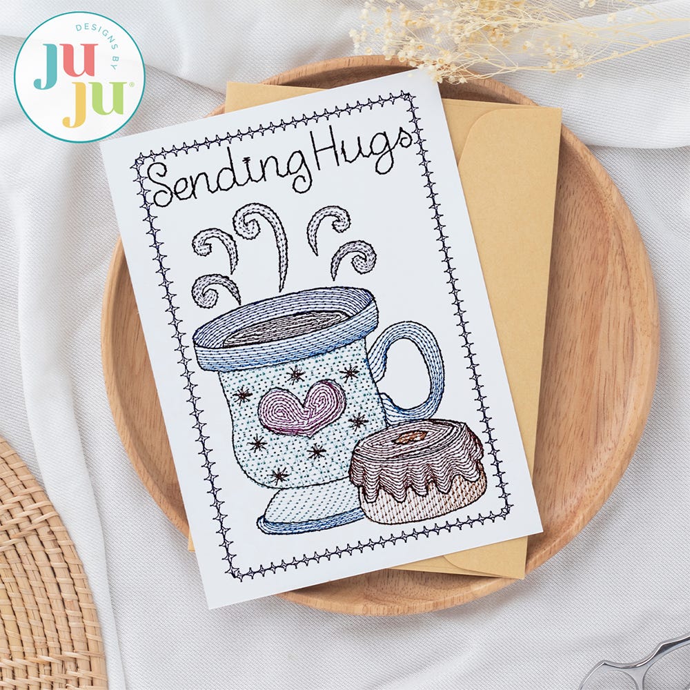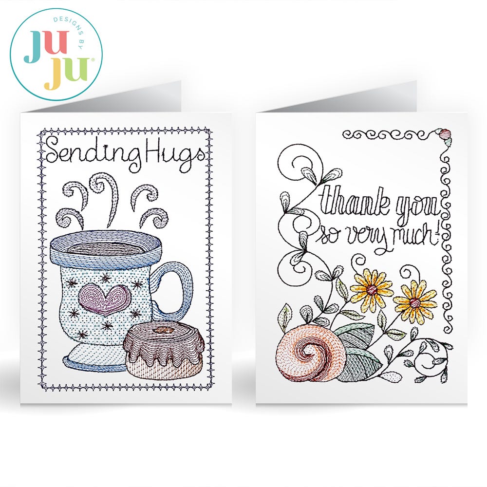 Stitch up some sweet sayings! Featuring two festive greeting card designs: “thank you so very much!” and “Sending Hugs”.