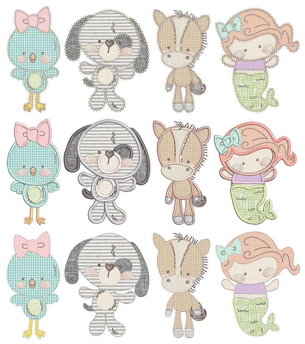 4 MORE adorable critters, in 3 styles each! Satin applique, bean stitch applique, and square stitch applique!