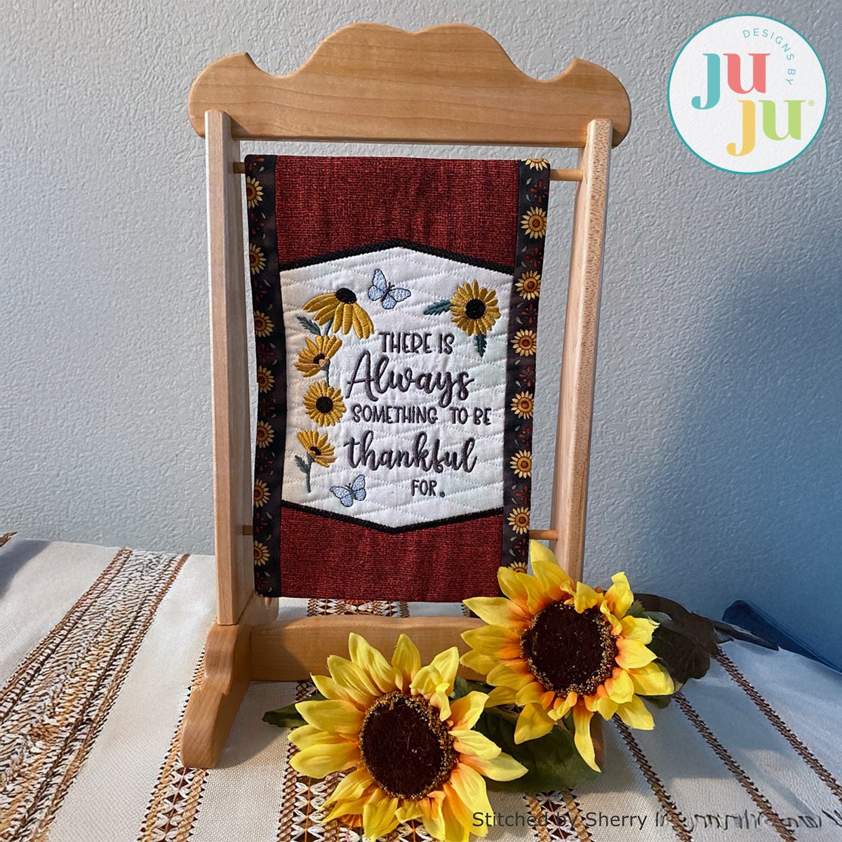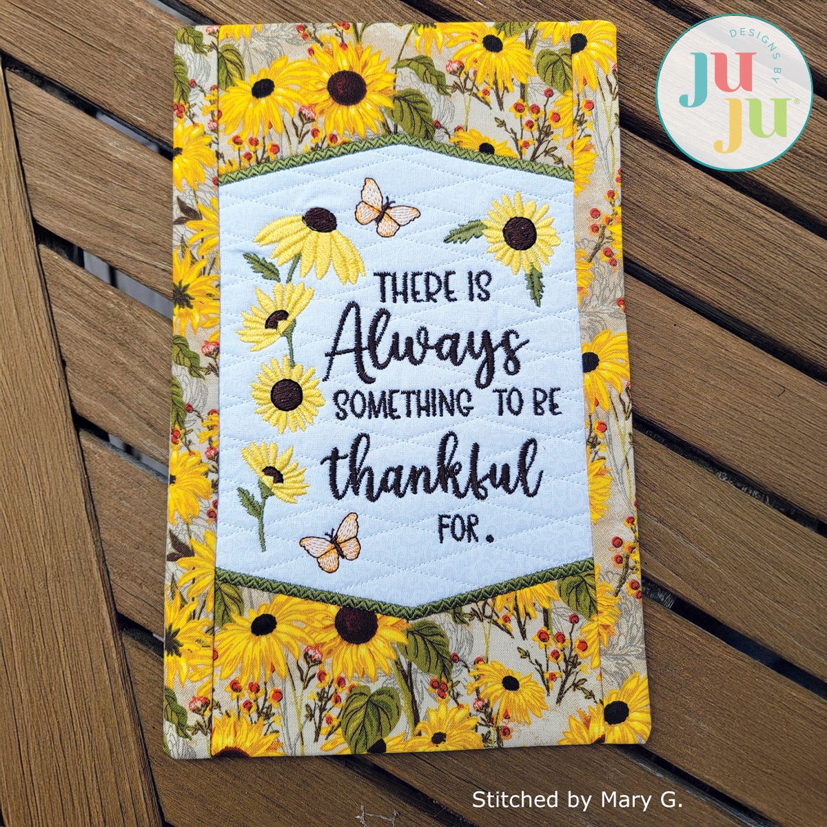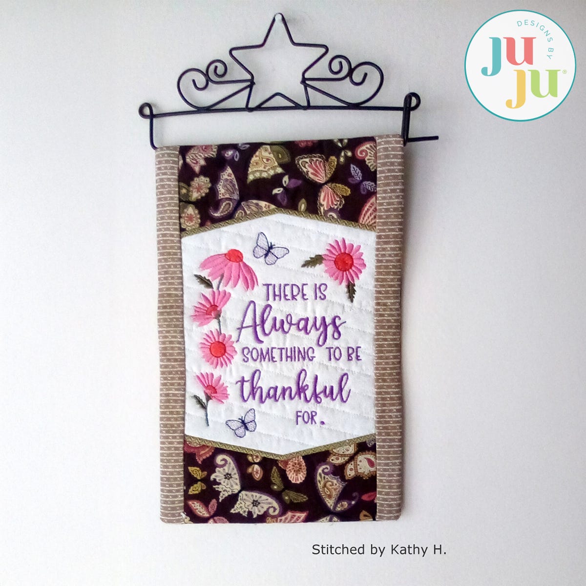 This mini quilt is perfect for decorating your home all year round. The background of the mini quilt is quilted in the hoop and the side borders get attached during the in the hoop process. The top and bottom have patterned applique edges giving the mini quilt a refined look. There is a “sleeve” in the back that will make it easy to hang the quilt. The sleeve, too, is applied during the embroidery process. No additional hand or sewing machine stitching is required.