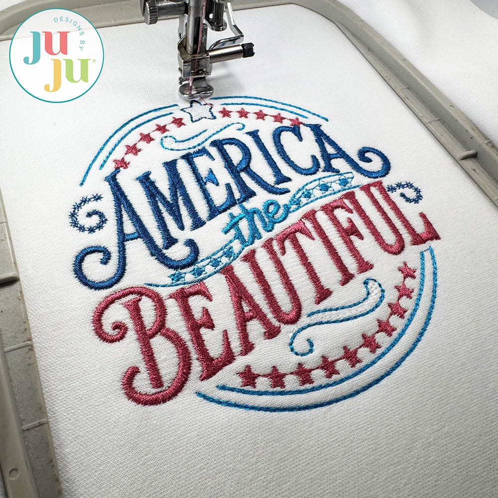 America the Beautiful! This word art design, embellished with stars and other decorative elements, is perfect for your patriotic stitching needs!