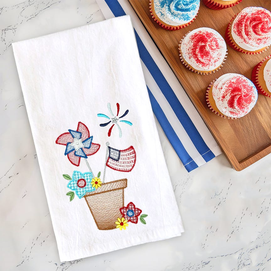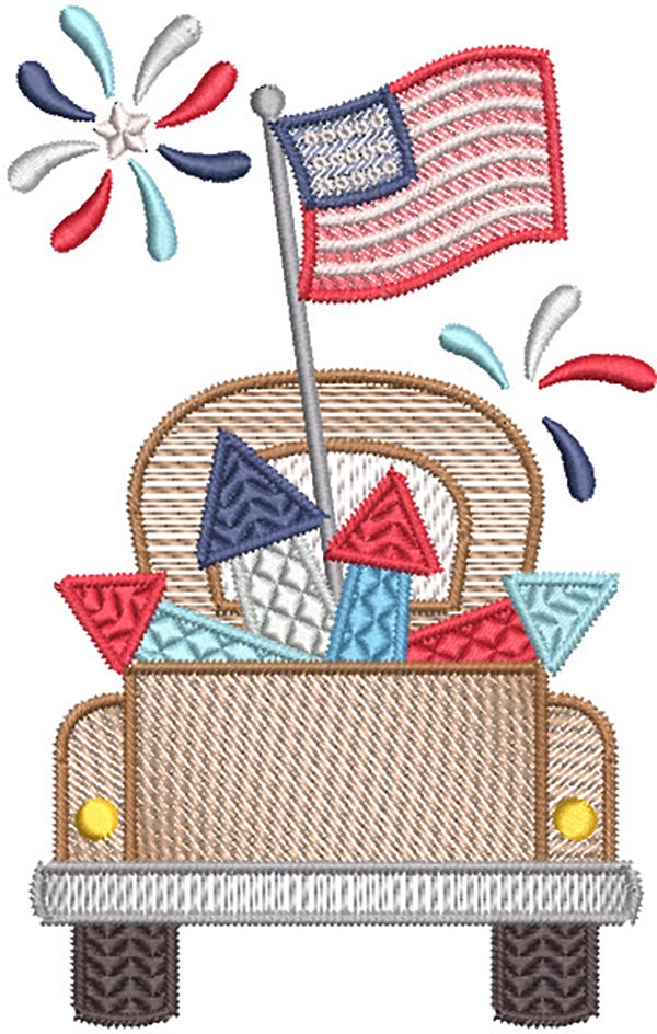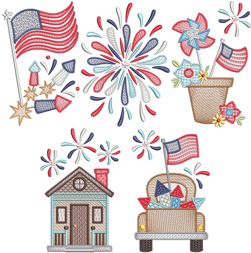Five adorable and patriotic Americana-themed designs featuring a blend of sketch and motif fills with stem stitch outlines in four sizes.