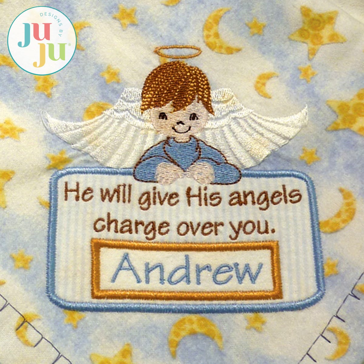 This small set contains 2 designs one with a boy angel, the other a girl angel. Intended for use on receiving and crib blankets, the designs would look equally well in the center of a wallhanging or pillow. The label itself is double appliqued. Easy instructions with many photos included with your purchase. For 5x7 hoops or larger. Alphabets used for the insertion of the name are our Petite French (Girl) as well as our Half Inch Architect (sold separately). Design does not come with any names or alphabets.