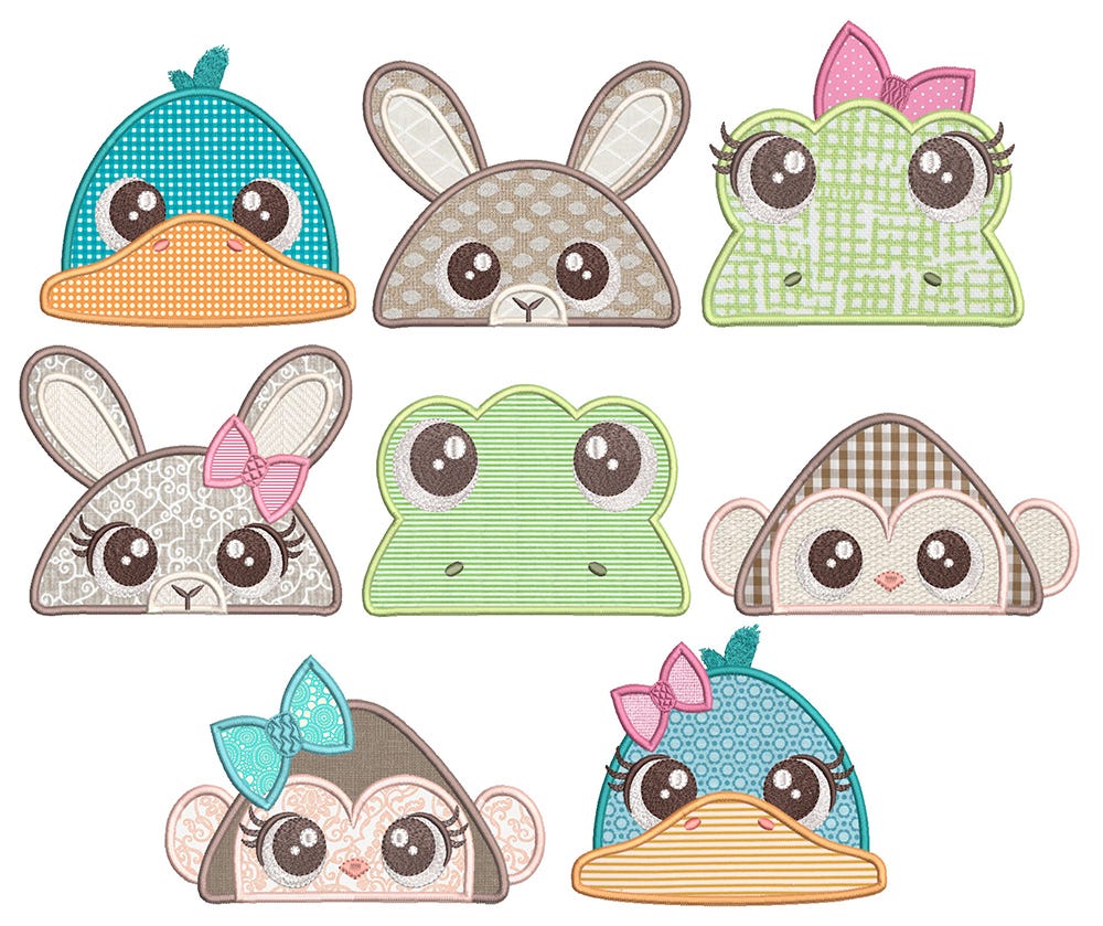 8 MORE super cute animal peekers in applique! We have a frog, duck, bunny and monkey in this set, both in male and female versions.