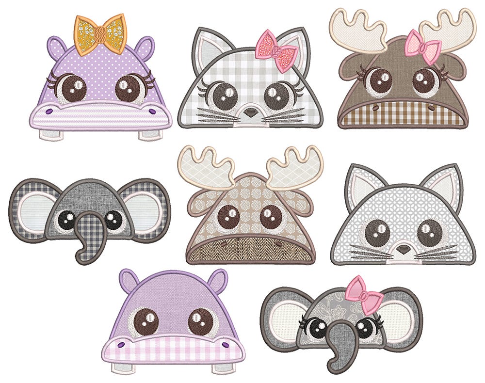 8 MORE super cute animal peekers in applique! We have a hippo, elephant, cat and moose in this set, both in male and female versions.