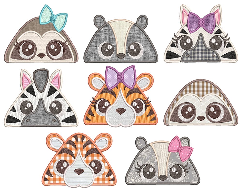 8 MORE super cute animal peekers in applique! We have a skunk, tiger, zebra and sloth included in this set, both in male and female versions.