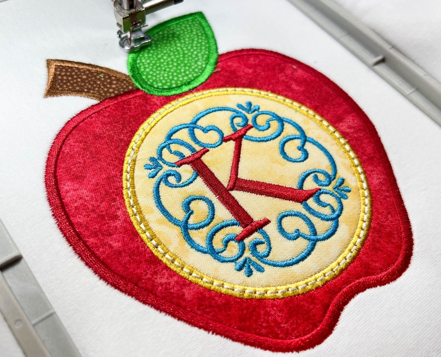 This four-fabric monogram frame applique features a bean stitch accent line on top of the satin stitches around the circle. It is designed to be personalized with a circular monogram of your choice!