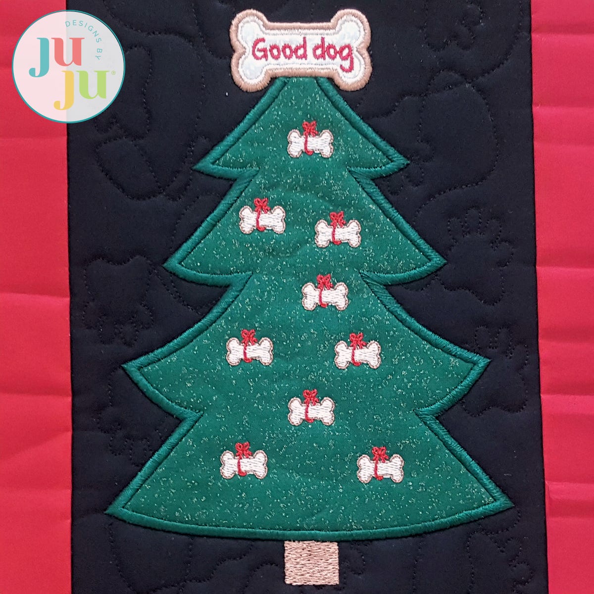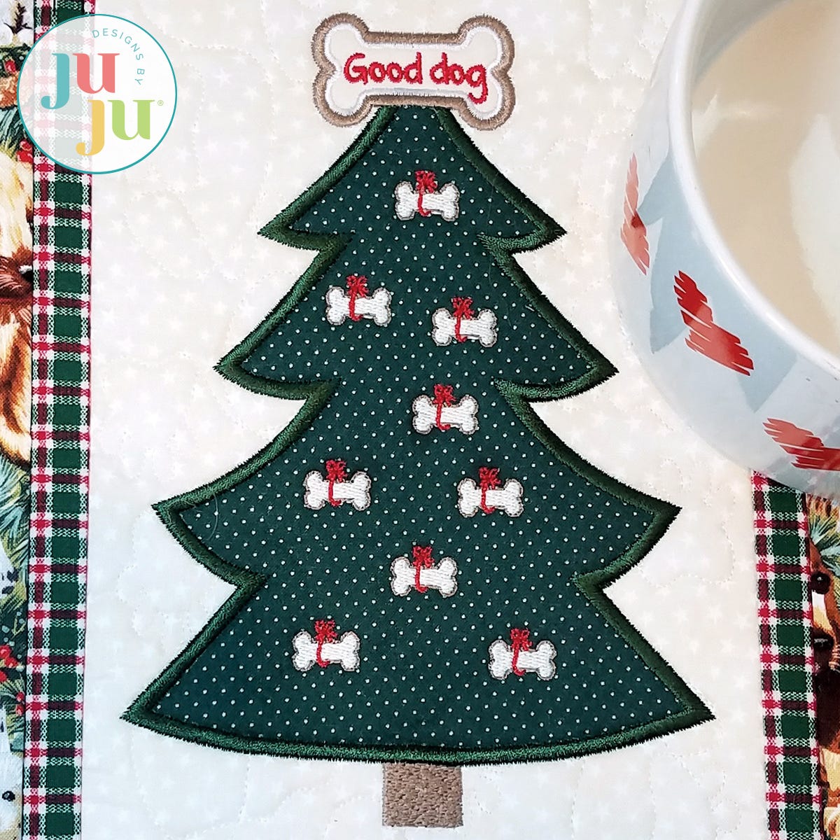 Use this fun applique design on items for a pet or pet owner. It's shown stitched out on our Christmas dog mat. The tree and "bone" are both applique. The wording "Good dog" is part of the design; the quilting stitches are not.