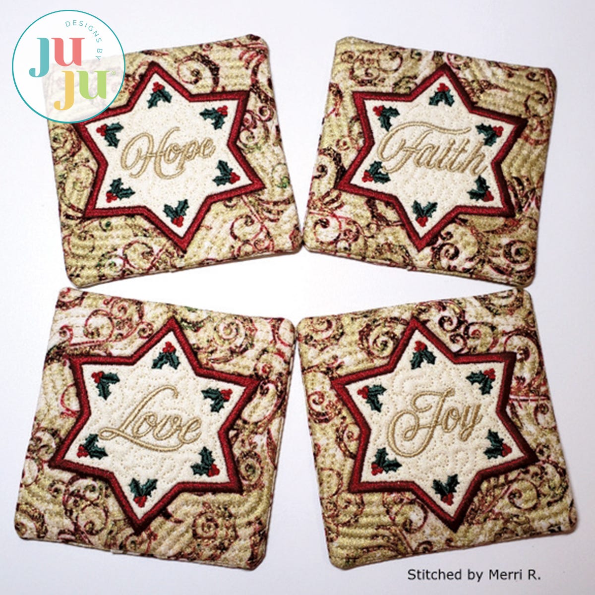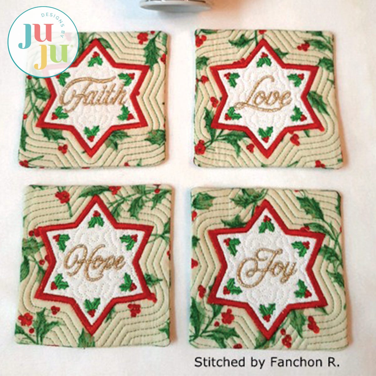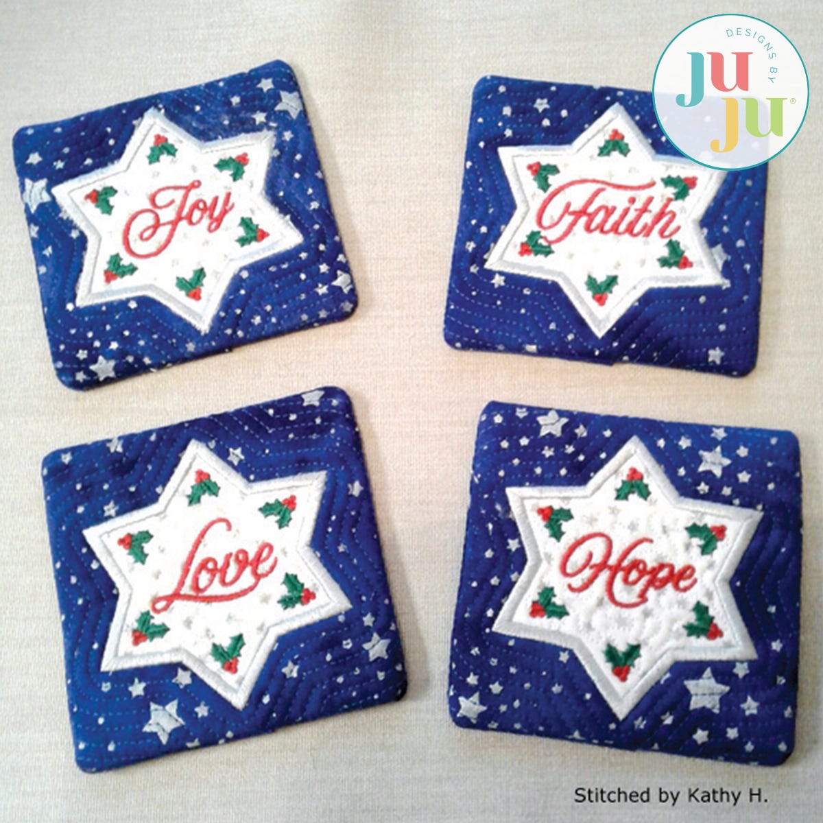 These slightly puffed coasters are fast to stitch and would make a great hostess gift or stocking stuffer. The coasters are quilted in the hoop and the center star is reverse appliqued. If you have never done this, it's very easy and we will show you how to. The coasters are completely stitched in the hoop. There is no other sewing machine or hand stitching required.