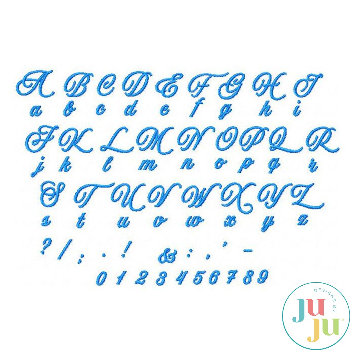 This elegant, whimsical font is available in two sizes: approximately 0.75” tall for capital letters (some may be slightly taller due to descenders) and a smaller version measuring about 1/2” tall. The larger capitals can also be used as a small monogram, while the font overall is perfect for personalizing gifts and labels. Your download includes all uppercase and lowercase letters, numbers 0 through 9, and commonly used punctuation. Files are provided in 10 different machine formats, as well as BX format for Embrilliance users.