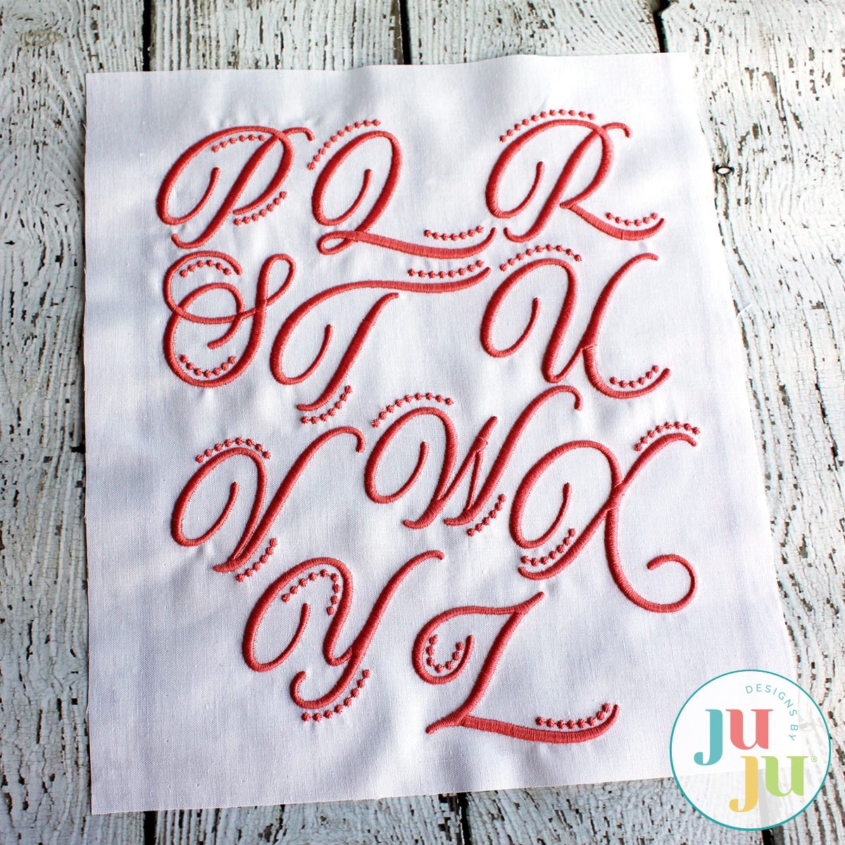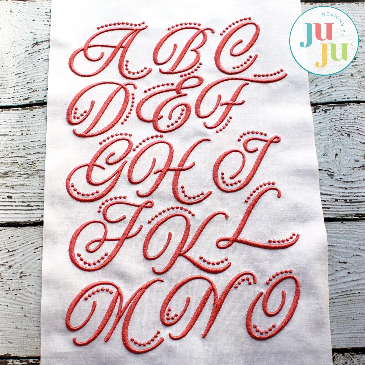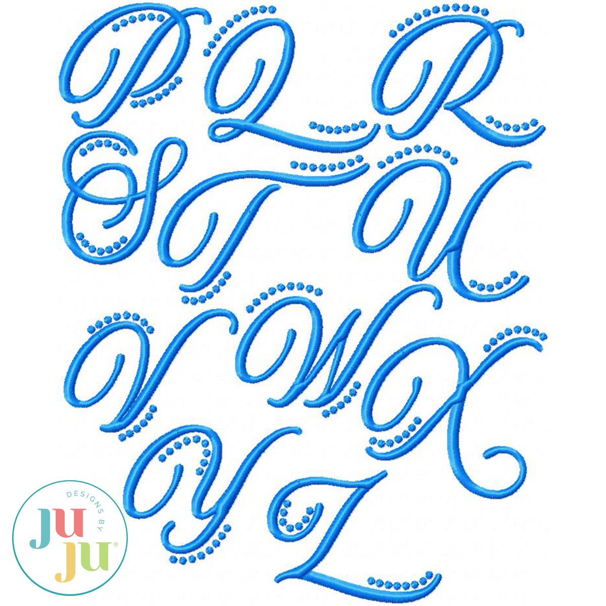 This elegant monogram is approximately 2" tall, with some letters larger due to their descendant characters. The French knots add an extra 0.25" to some of the letters. There are 26 capital letters; no numbers, no lower case letters, no punctuations.