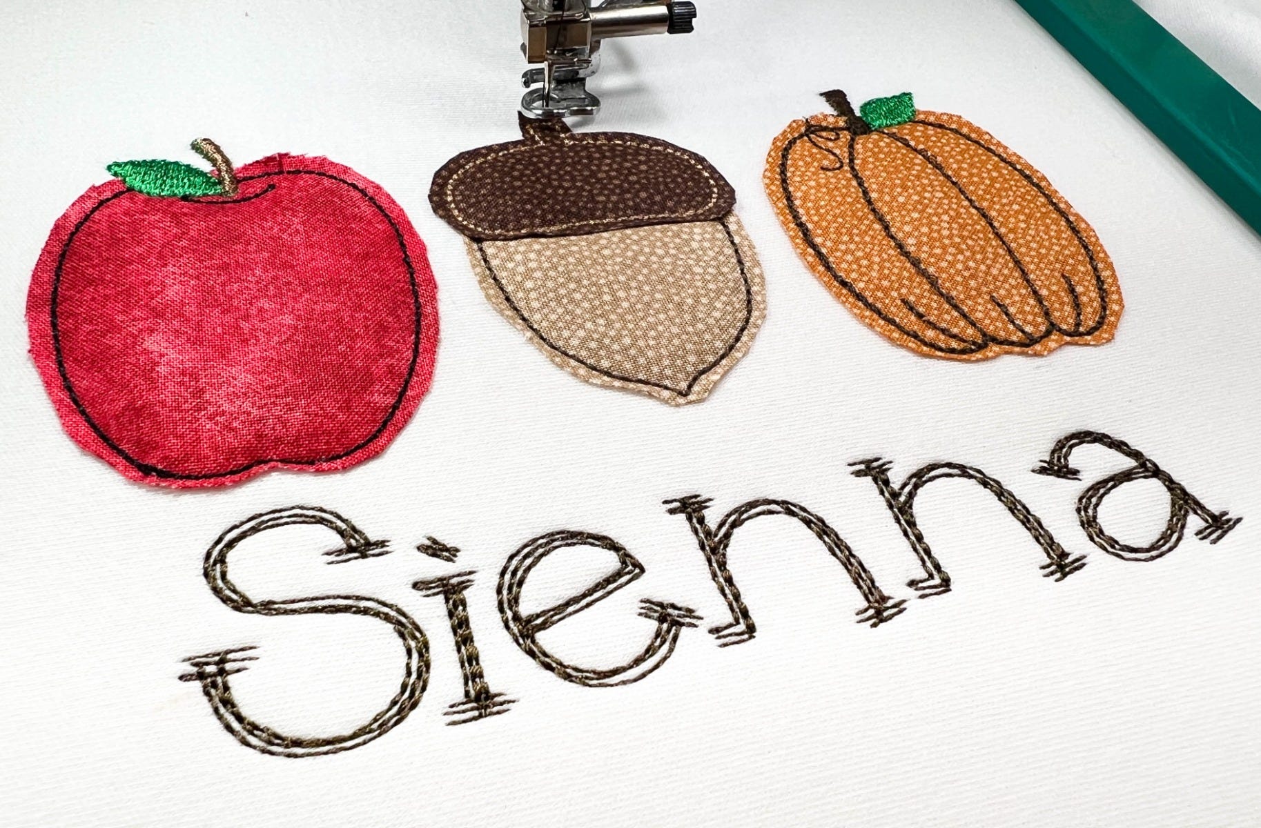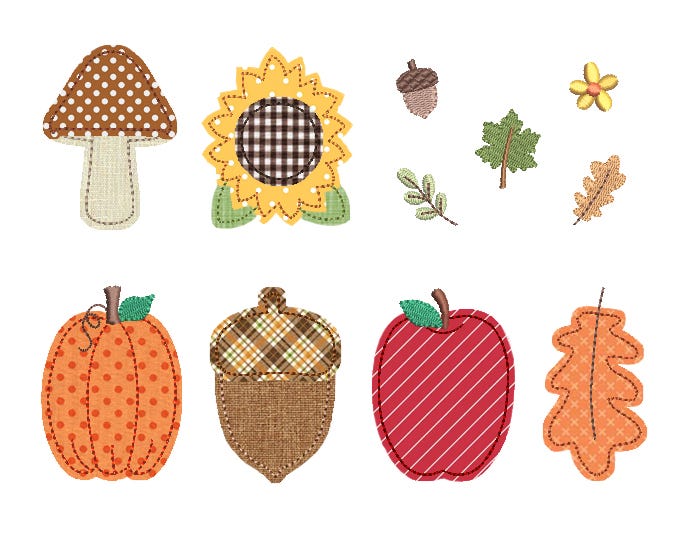 The Autumn Kit includes six appliques (Acorn, Apple, Leaf, Mushroom, Pumpkin, Sunflower) and five embroidery only accents (Mini Acorn, Mini Branch, Miny Flower, Mini Leaf, Mini Maple Leaf).