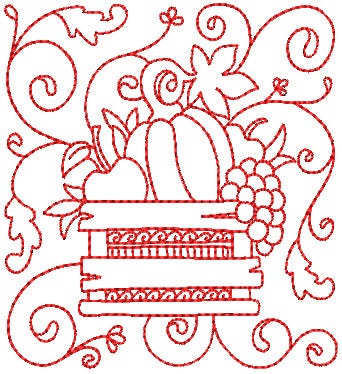 Redwork quilt blocks include both a single run and triple run block in 6 sizes: 4 inch, 5 inch, 6 inch, 7 inch, 8 inch and 9 inch (9 inch is for Brother Dream machine users and others who have 9 inch or greater square hoop capabilities)