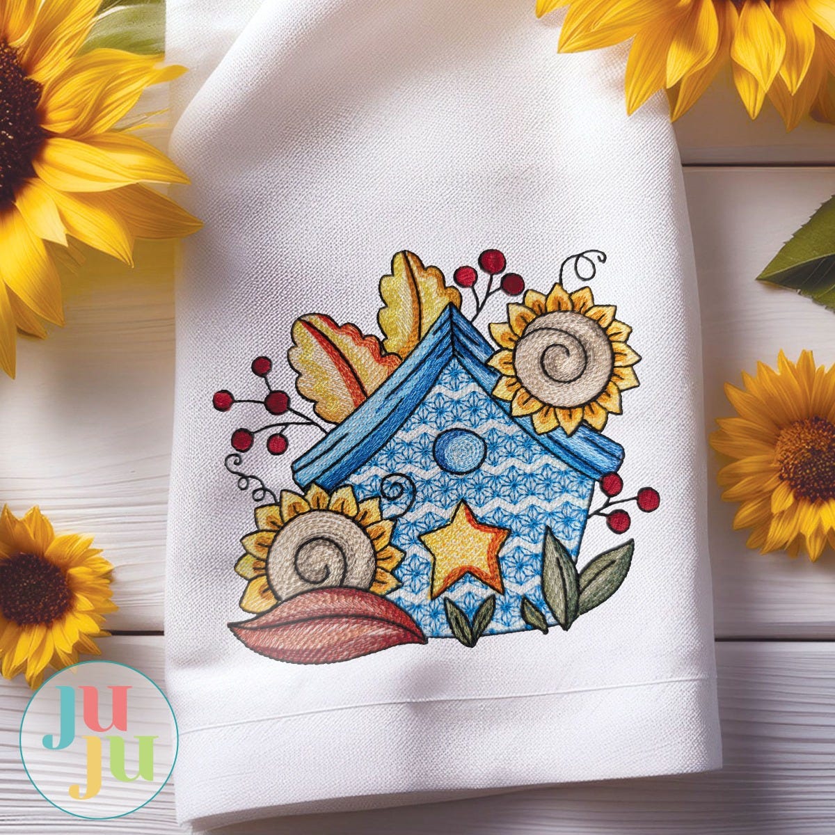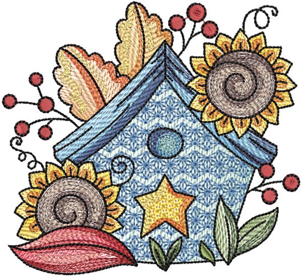 This birdhouse is decorated for autumn with sunflowers and fall leaves. This single design features multiple color layers of lighter density fill to create a blended, variegated, textured look. Four sizes included (4x4, 5x7, 6x10 and 8x8).