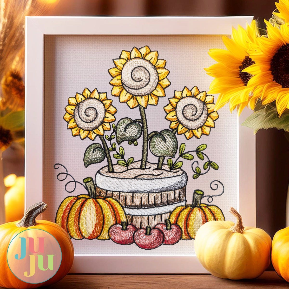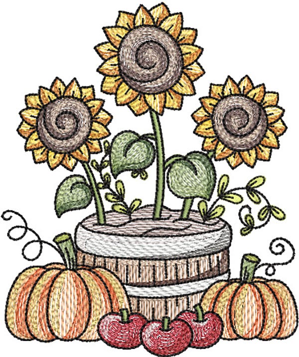 Celebrate the arrival of autumn with sunflower, pumpkins and apples. This single design features multiple color layers of lighter density fill to create a blended, variegated, textured look. Four sizes included (4x4, 5x7, 6x10 and 8x8).