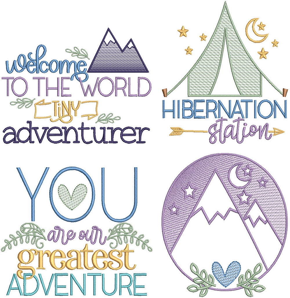 4 more precious adventure inspired word art designs for baby! These designs are embroidery-only featuring sketch fill objects with satin stitch lettering and design details.