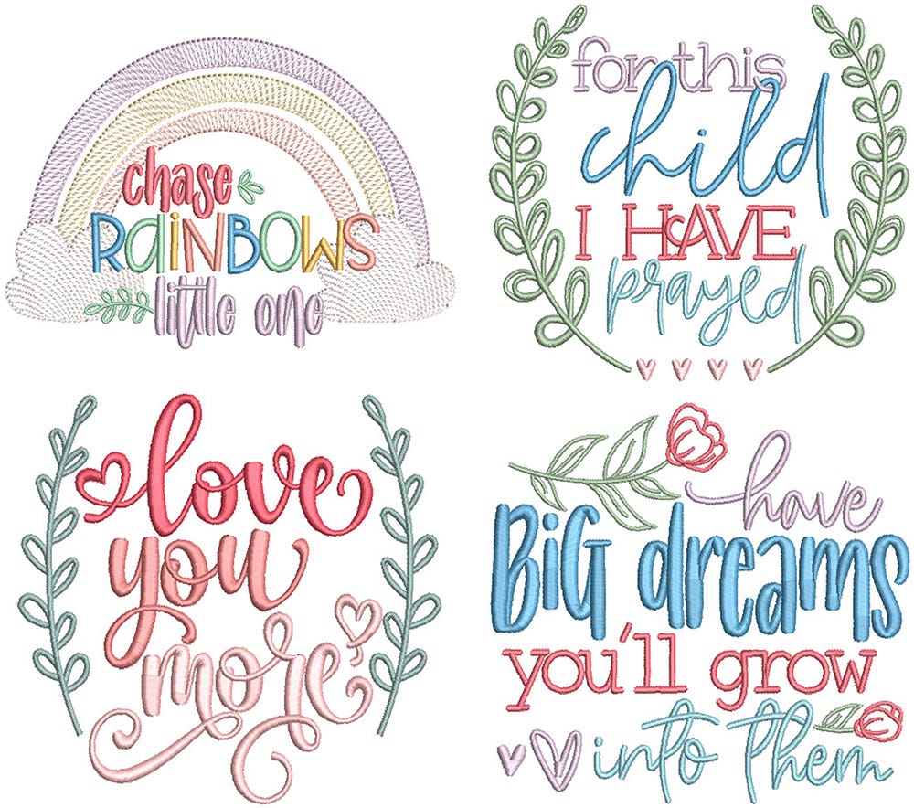 4 more precious word art designs for babies! These designs are embroidery-only with satin stitch lettering and design details. Please note the rainbow and clouds feature a light and airy sketch fill pattern.