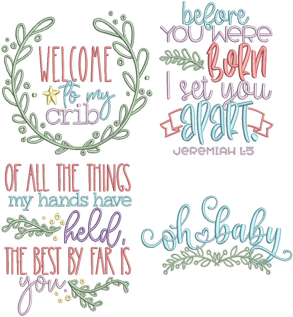 Another 4 precious word art designs for babies! These designs are embroidery-only with satin stitch lettering and designĀ details.