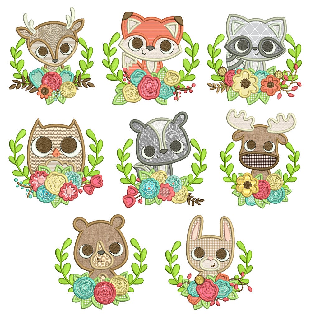 8 precious woodland critters in floral laurel wreaths in applique. Darling and unique, these are sure to make adorable embellishments to your baby projects!