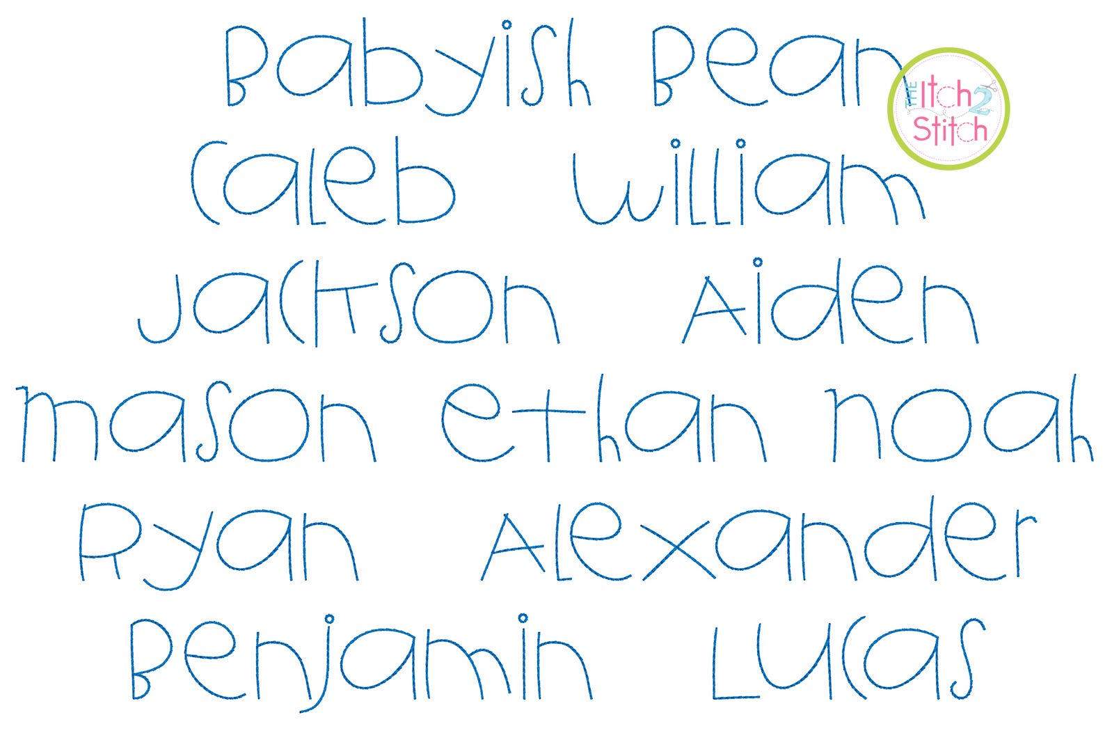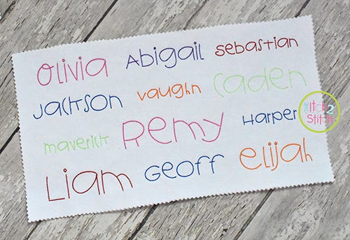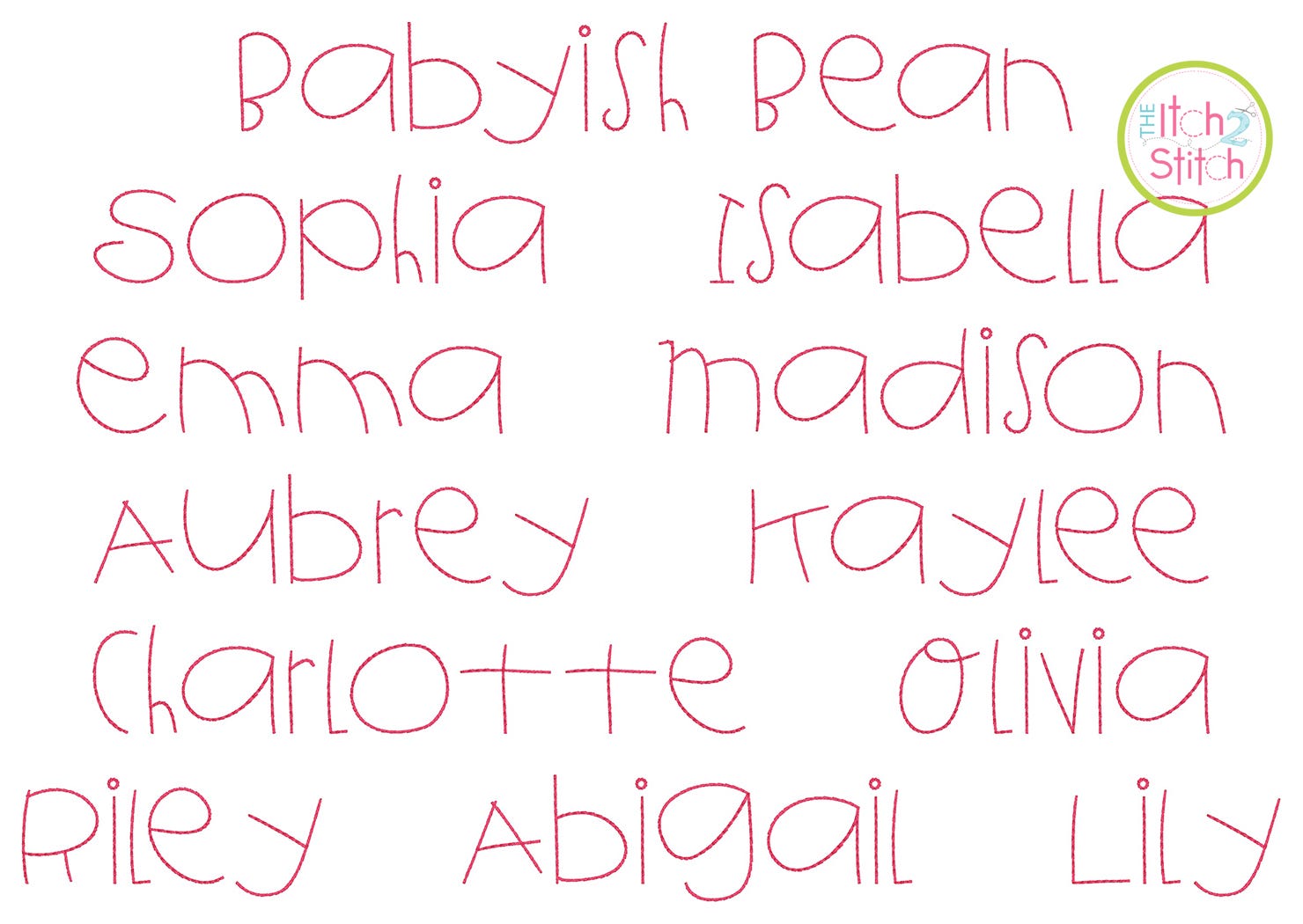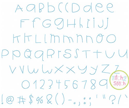 You will receive all Aa-Zz letters, numbers, and punctuation (80 files) in eleven sizes. The font sizes are based on the height of the capital I, then scaled appropriately in keeping with the original artwork. In this fun and quirky font, there is no consistency to the height nor width of each letter, so text designs will likely have an overall height greater than the stated size. Due to scale, a few files from the 3" size do not fit in a 4x4 hoop.