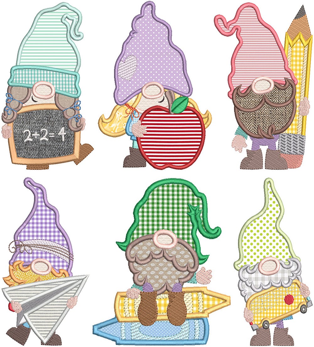 6 sweet, school ready gnomes in applique!