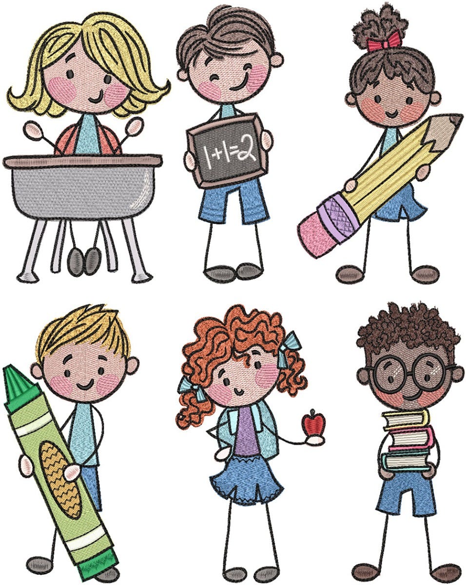 Head back to the classroom with these six sweet Back to School Stix People! Embroidery-only with a mix of split satin