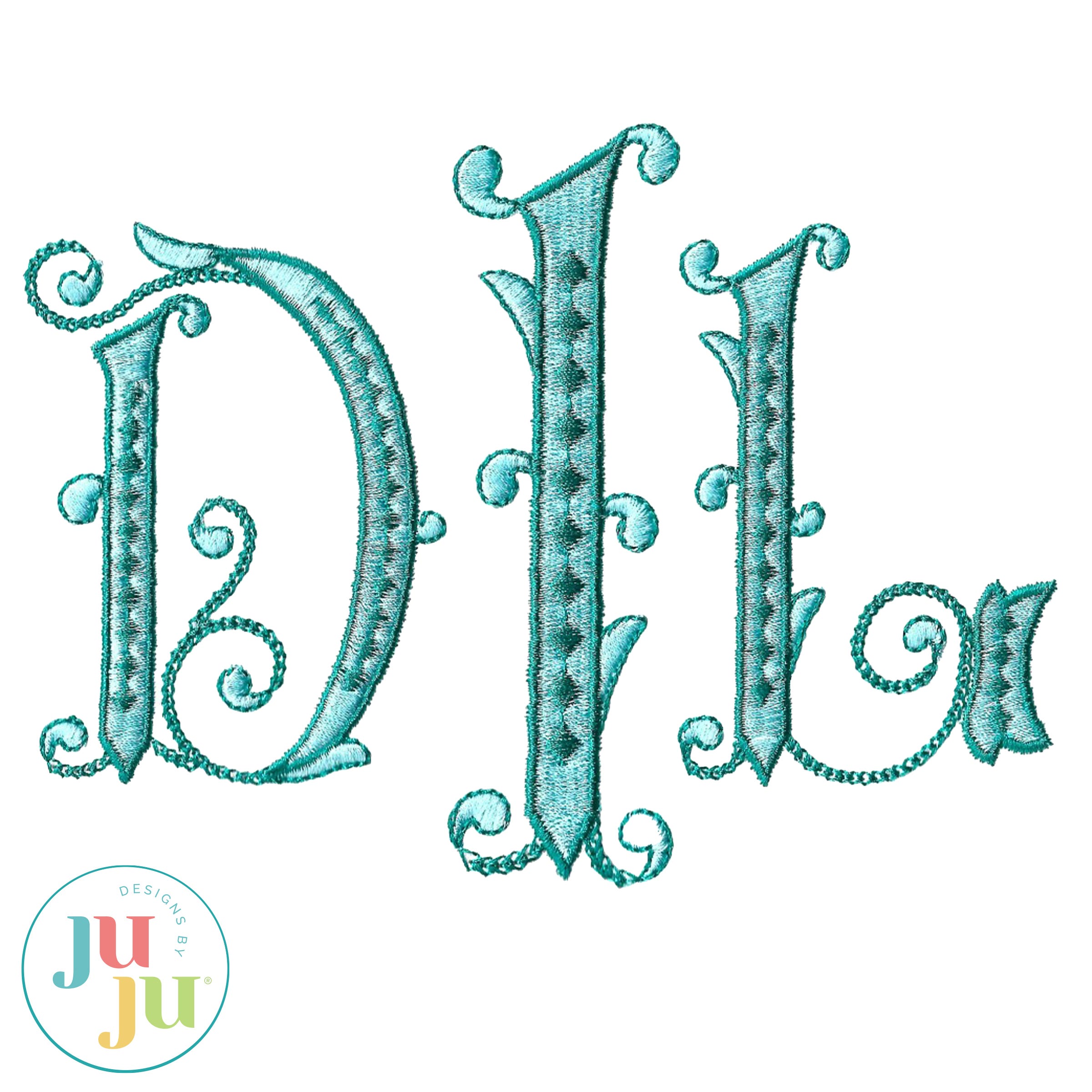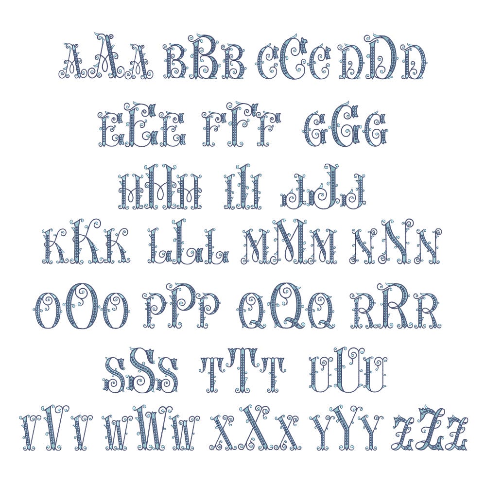 Our elegant, embroidery-only, Baroque Beauty Monogram features a two-color blend of fill stitch lettering with satin stitch outlines, accented with satin stitch diamonds, chainstitch swirls, and other lovely details.