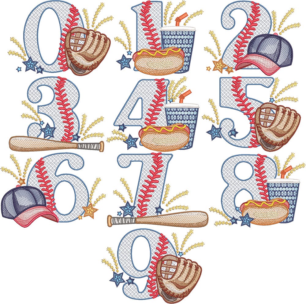 Each motif fill stitch number is topped with embroidered baseball stitches and stars, as well as various baseball-themed items such as gloves, bats, caps, hotdogs, and sodas. These themed toppers feature a variety of stitch types including: satin, motif fill, and multiple color layers of lighter density sketch fill to create a blended, variegated, textured look.