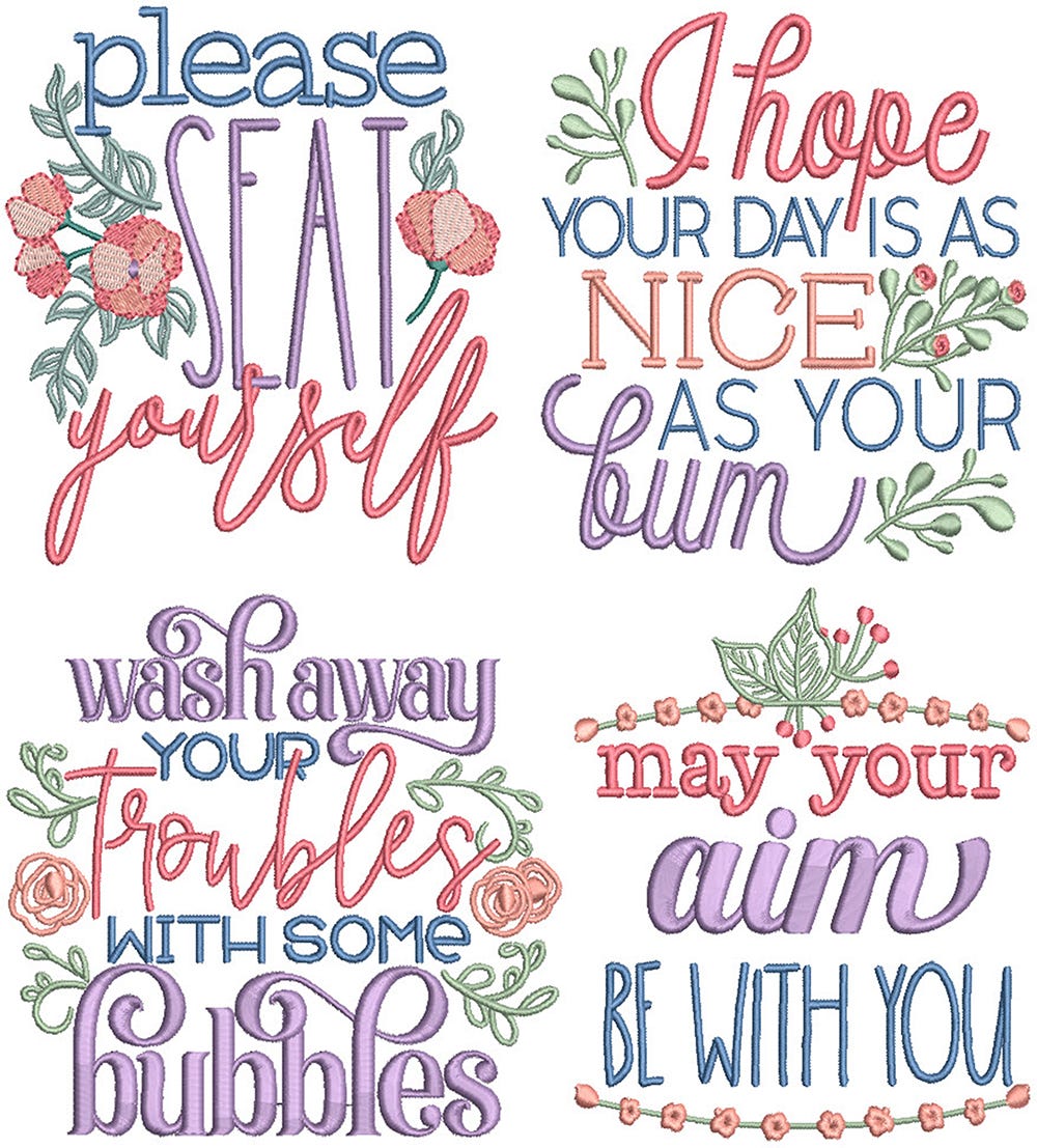 4 pretty and quippy bathroom inspired word art designs! These designs are embroidery-only featuring satin stitch lettering with satin stitch and fill stitch design details.