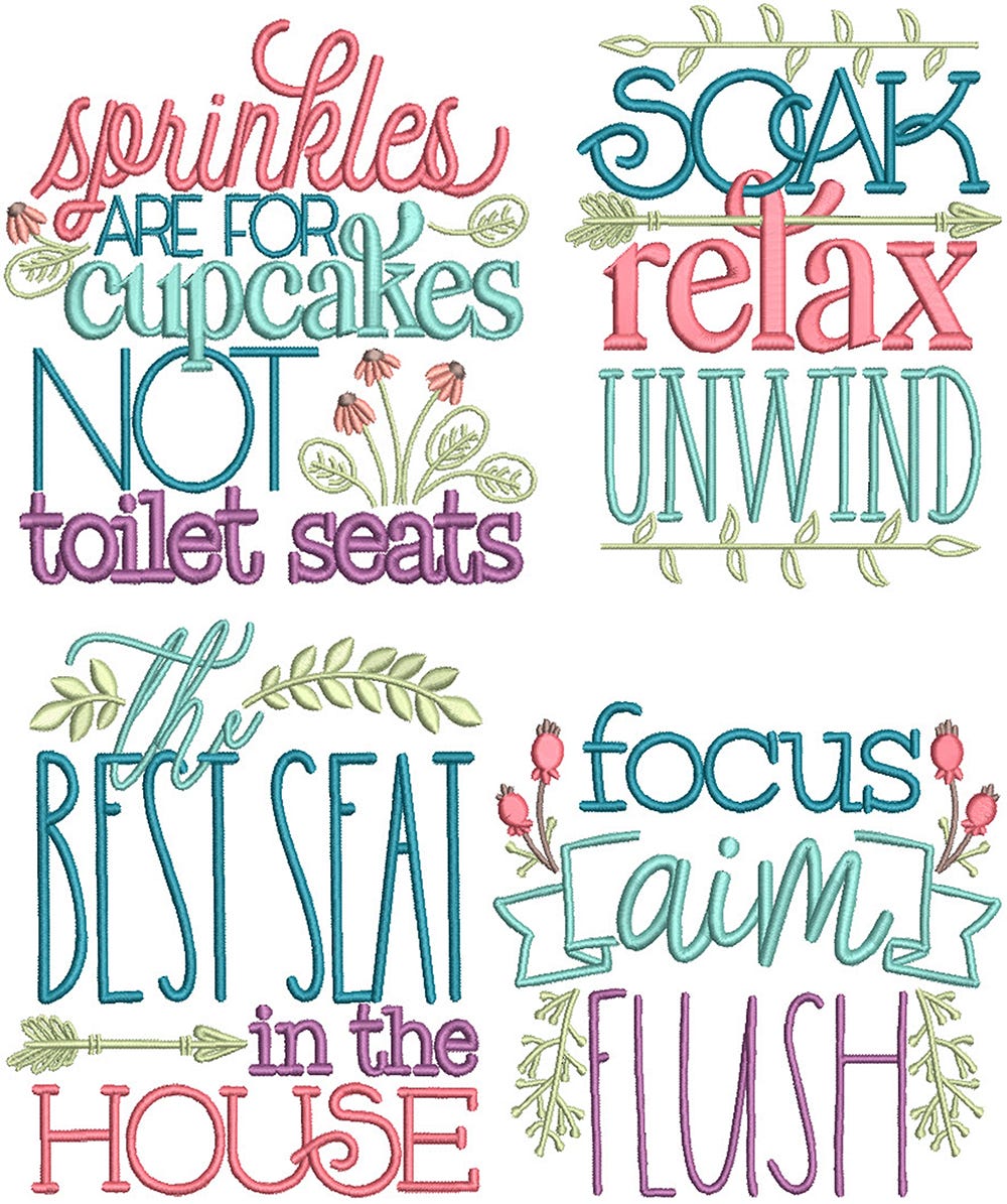 4 more pretty and quippy bathroom inspired word art designs! These designs are embroidery-only featuring satin stitch lettering and design details.