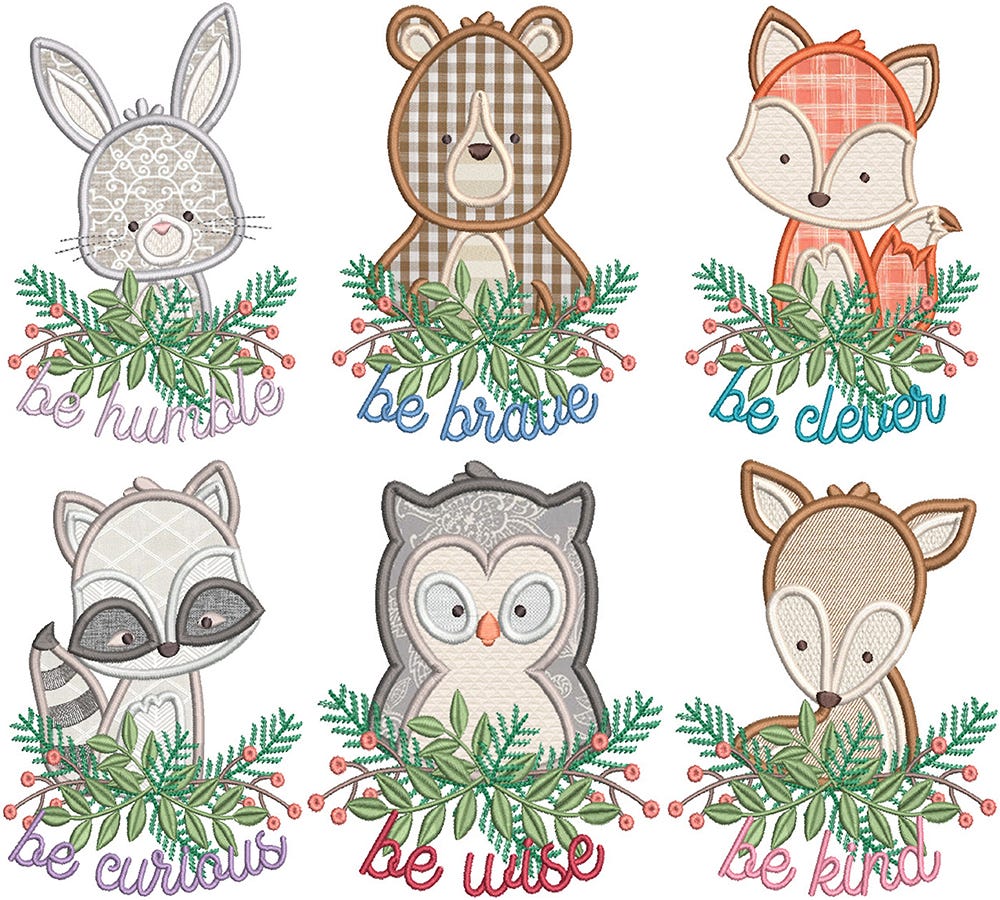 6 adorable and sweet "be kind" critters in applique! In this set we have a bunny, bear, fox, raccoon, owl and a deer.