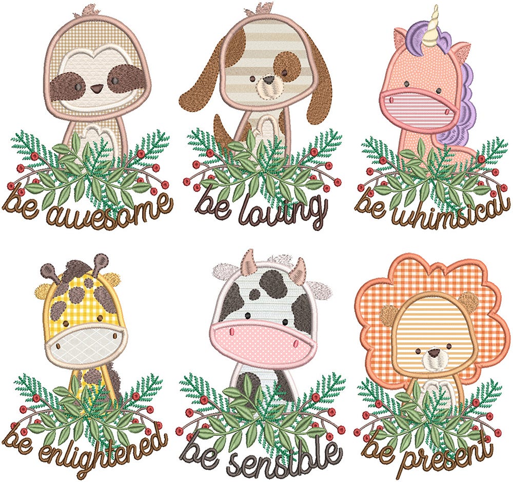 6 MORE adorable and sweet ābe kindā critters in applique! In this set we have a giraffe, cow, puppy, sloth, lion and a unicorn.