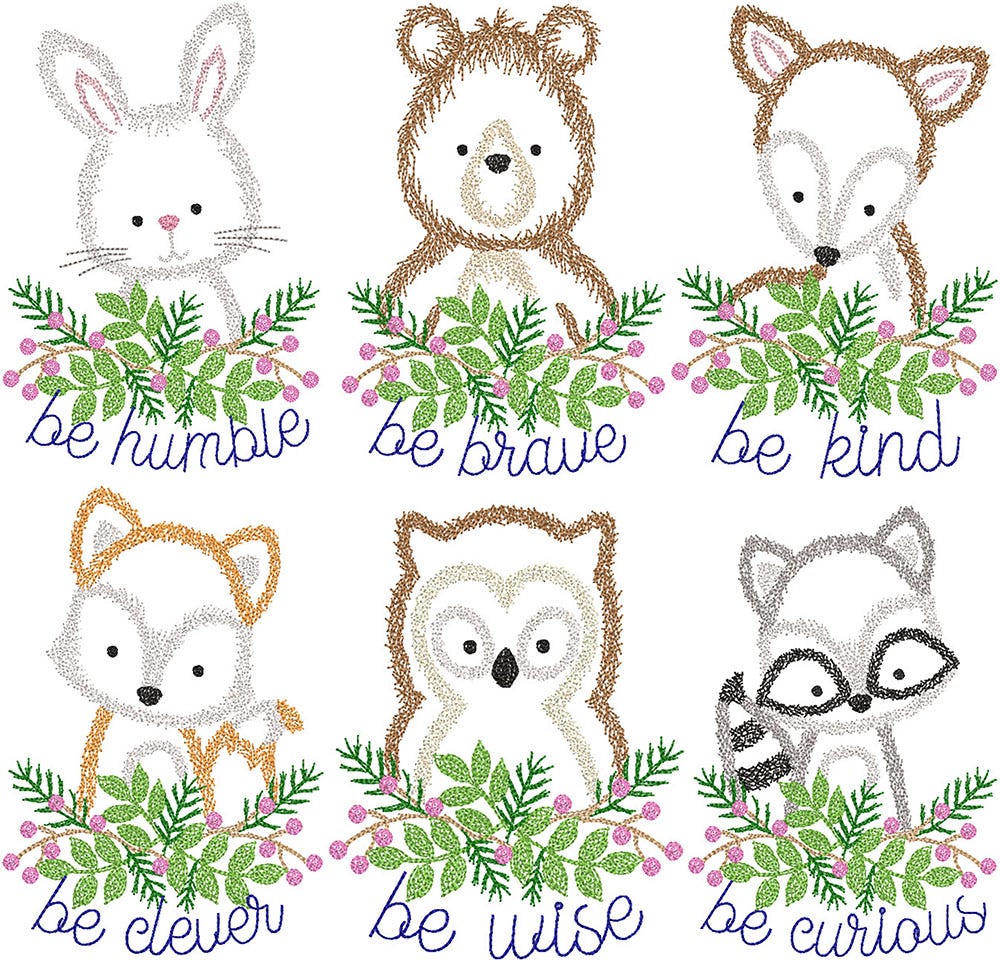 6 adorable and inspiring sketchy critters! These embroidery-only designs have a hand-stitched look for a vintage feel!