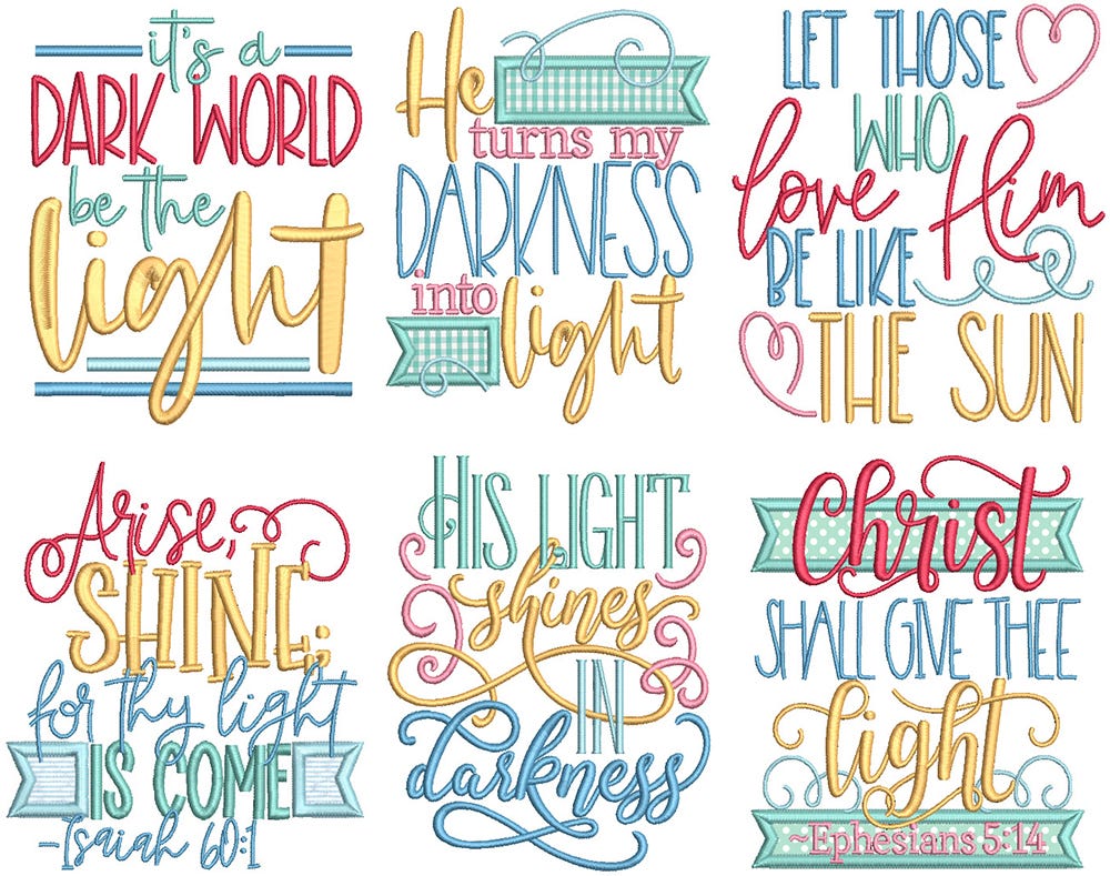 *Please note that the following designs contain applique components: He turns my darkness into light / Arise, shine for the light is come - Isaiah 60:1 / Christ shall give thee light - Ephesians 5:14