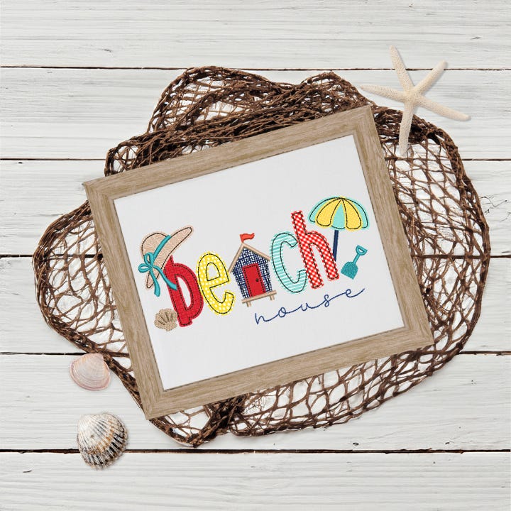 "Beach House" sample shows several designs from this set combined with Daisy Doodle Alphabet and Best Friend Forever Script Bean Embroidery Font, not included.