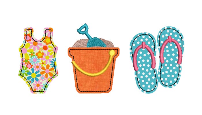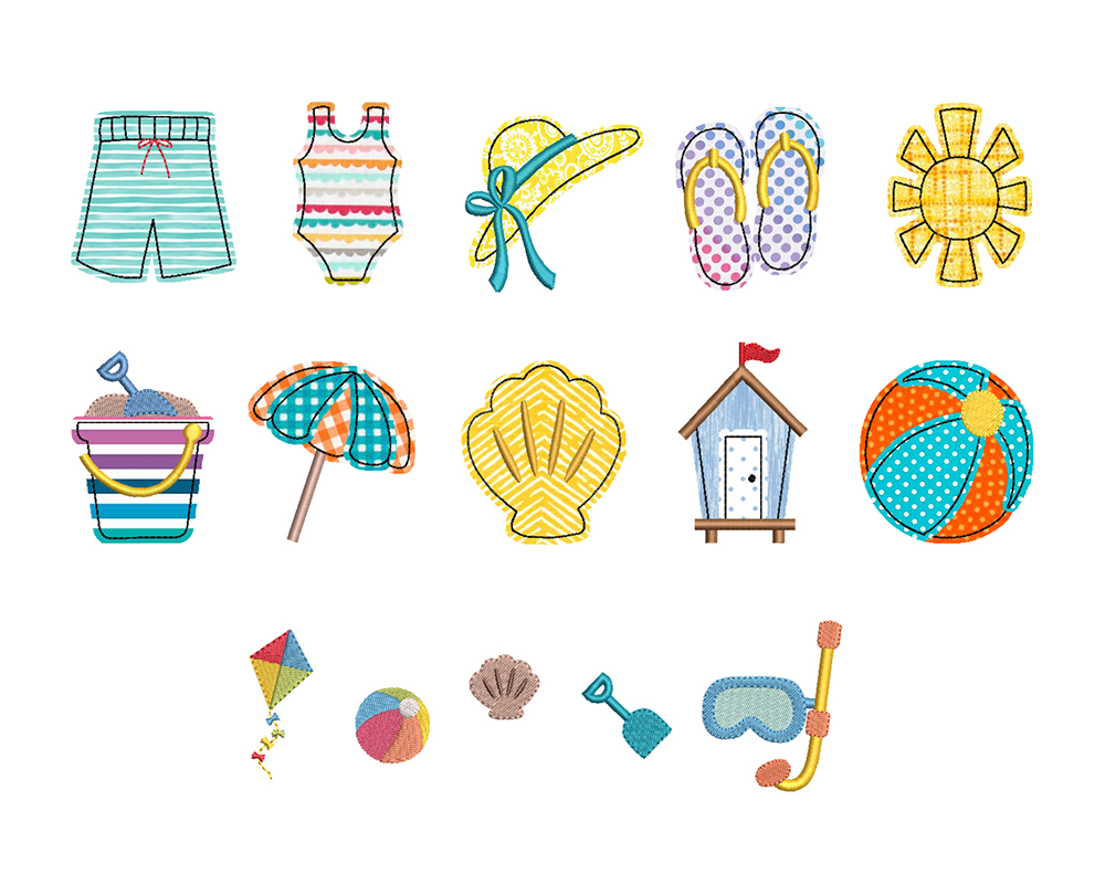 The Beach Kit includes ten appliques (Bathing Suit 1, Bathing Suit 2, Beach Ball, Beach Hat, Beach Hut, Flip Flops, Sand Pail, Seashell, Sun and Umbrella) and five embroidery-only accents (beach ball, seashell, shovel, kite, snorkle)